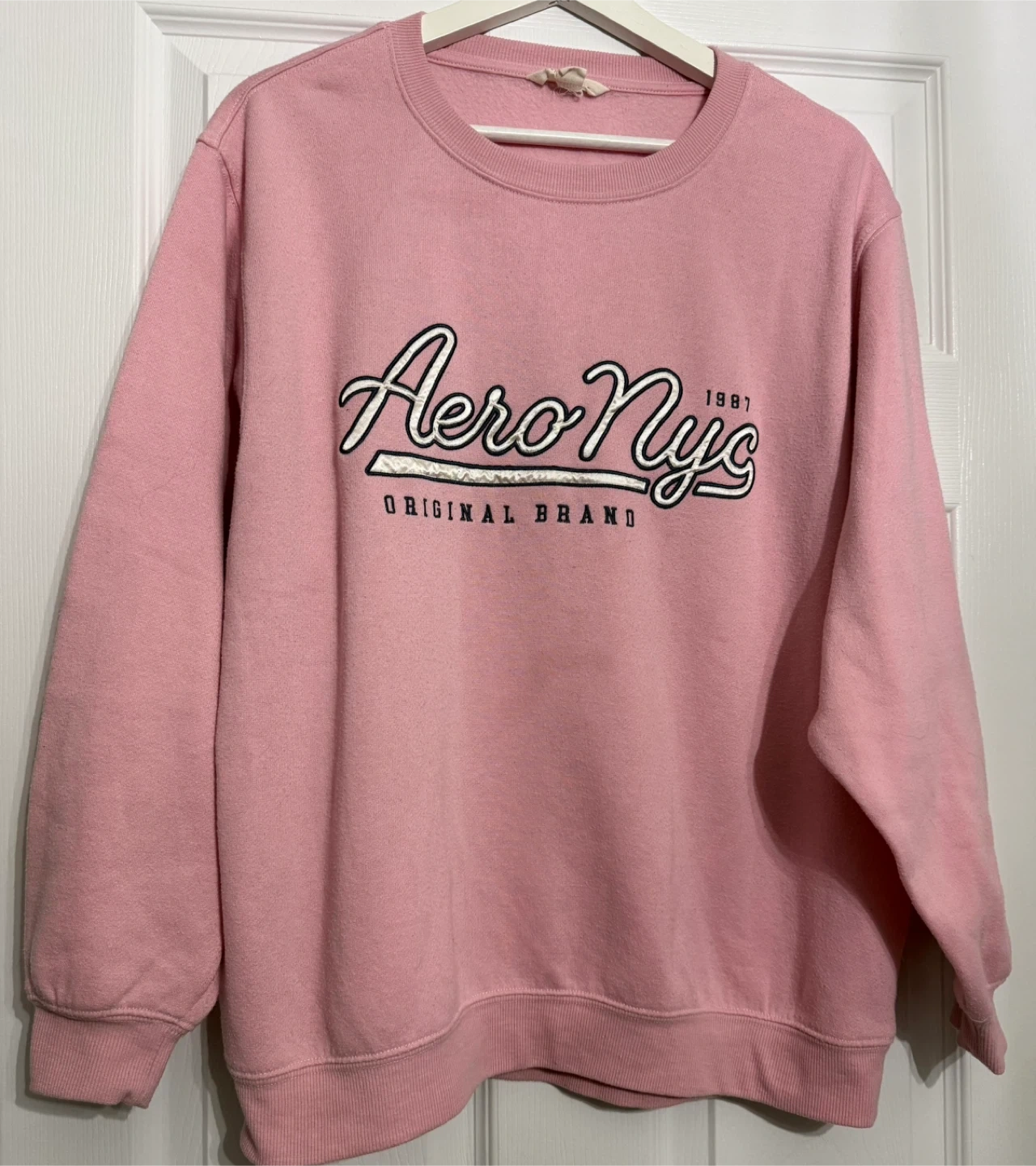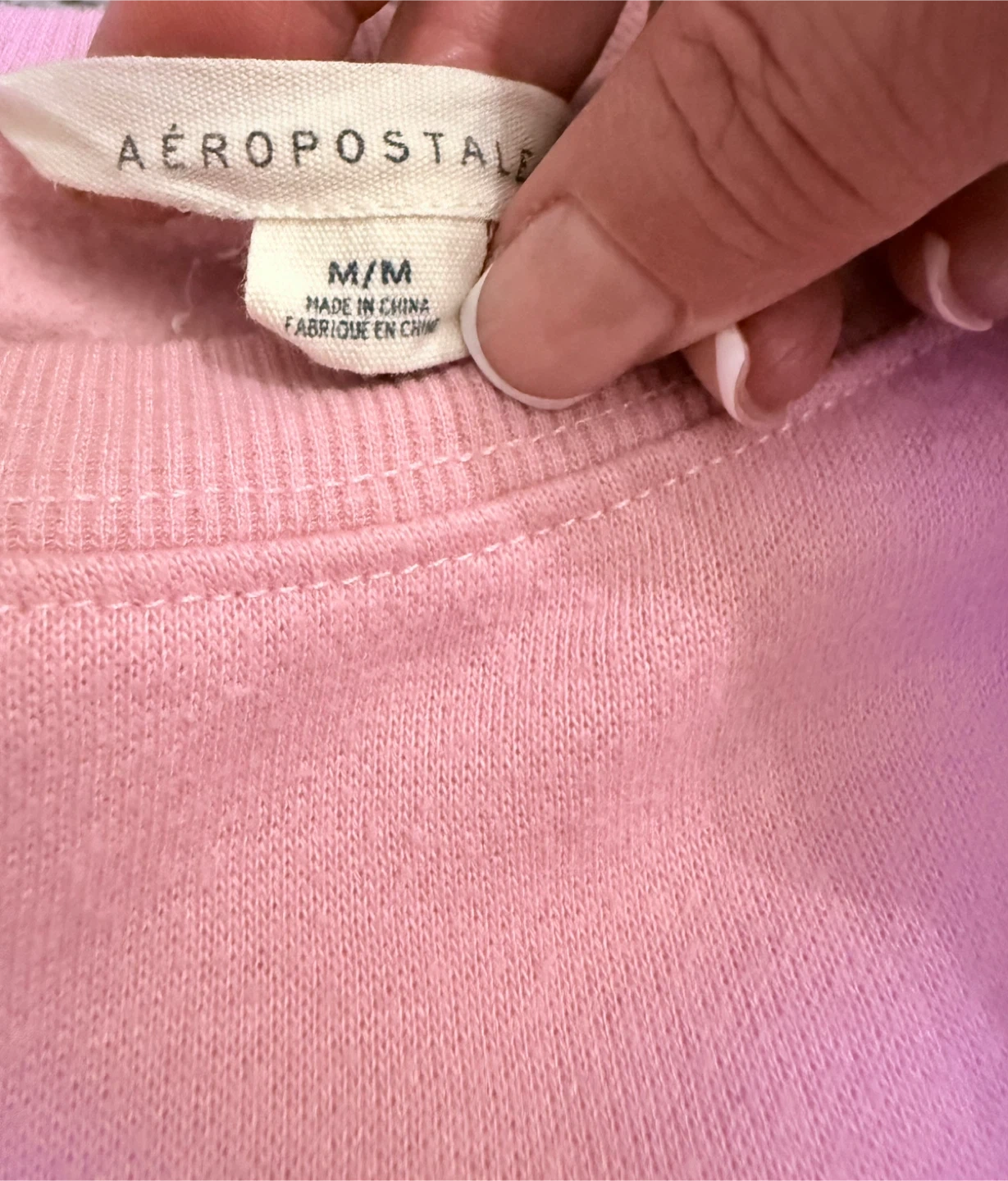 This is a pink Aéropostale crewneck sweatshirt with the "Aero NYC" graphic on the front. It's a size medium. Made in China.