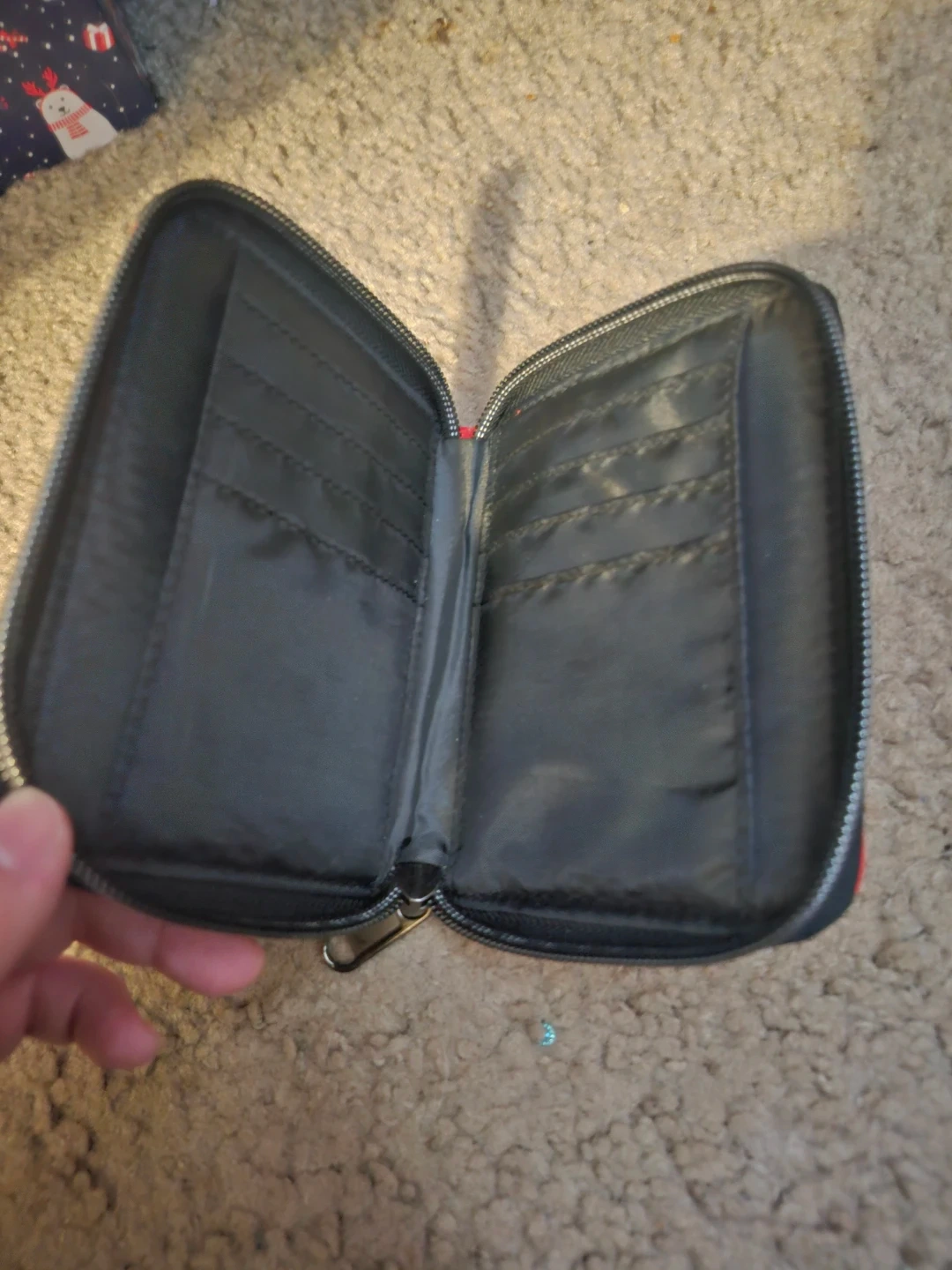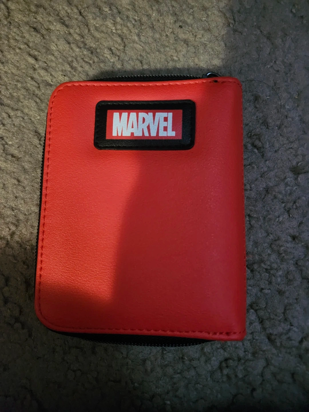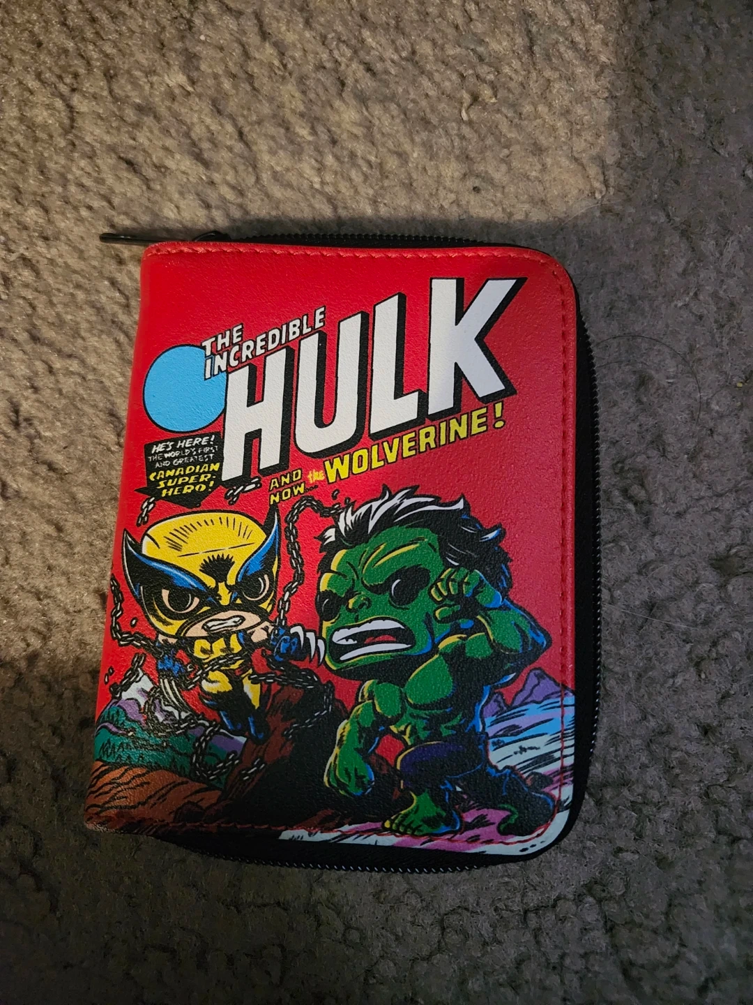 Red zippered wallet featuring Marvel's The Incredible Hulk and Wolverine comic book art. It's designed with multiple card slots inside. A cool accessory for any fan!