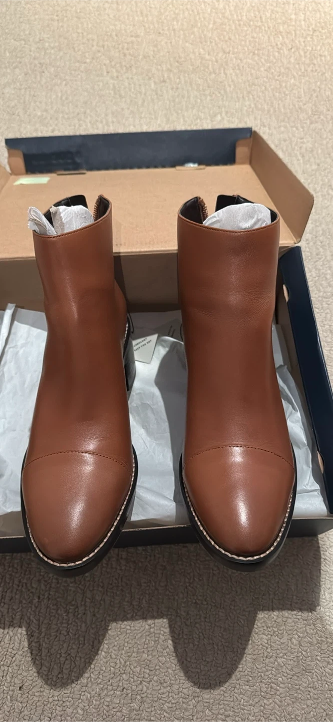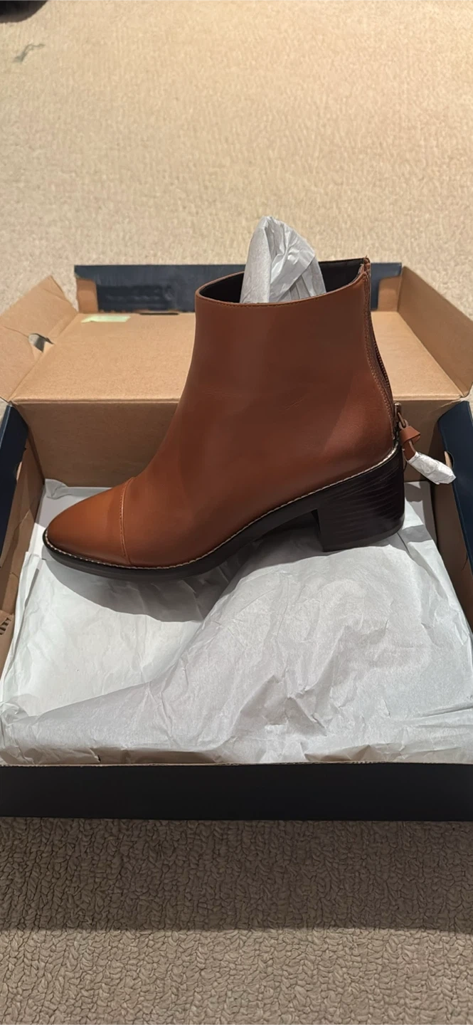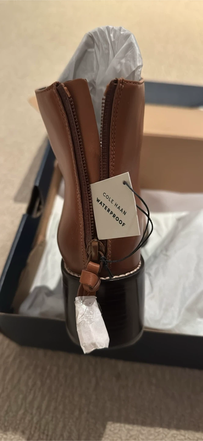 Brand new Cole Haan Winnie boots in British Tan. They're waterproof leather with a back zipper. Includes original box. Size 7
