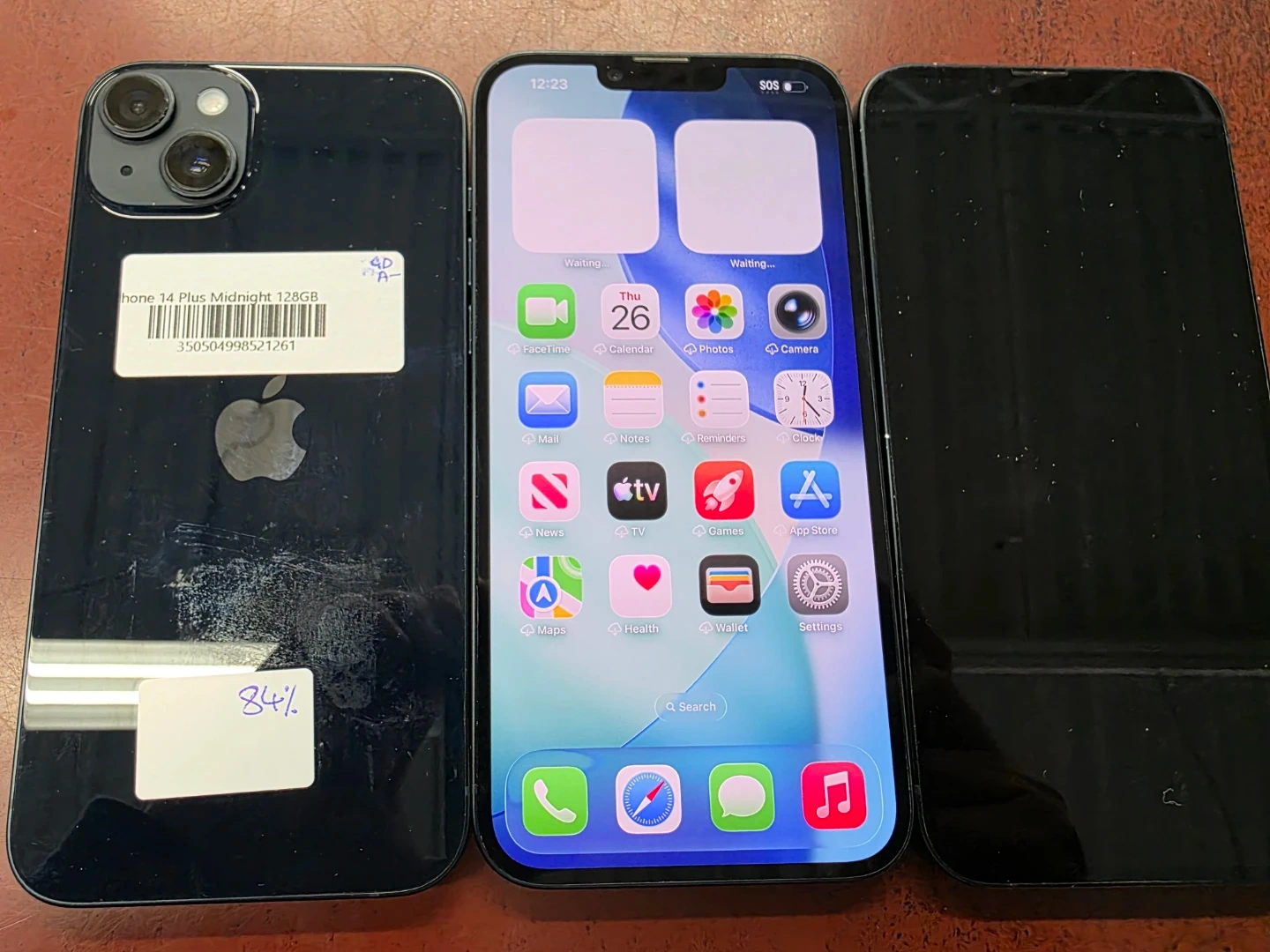 This is an Apple iPhone 14 Plus in Midnight with 128GB of storage. The battery health is at 84%. It comes with the original box.
