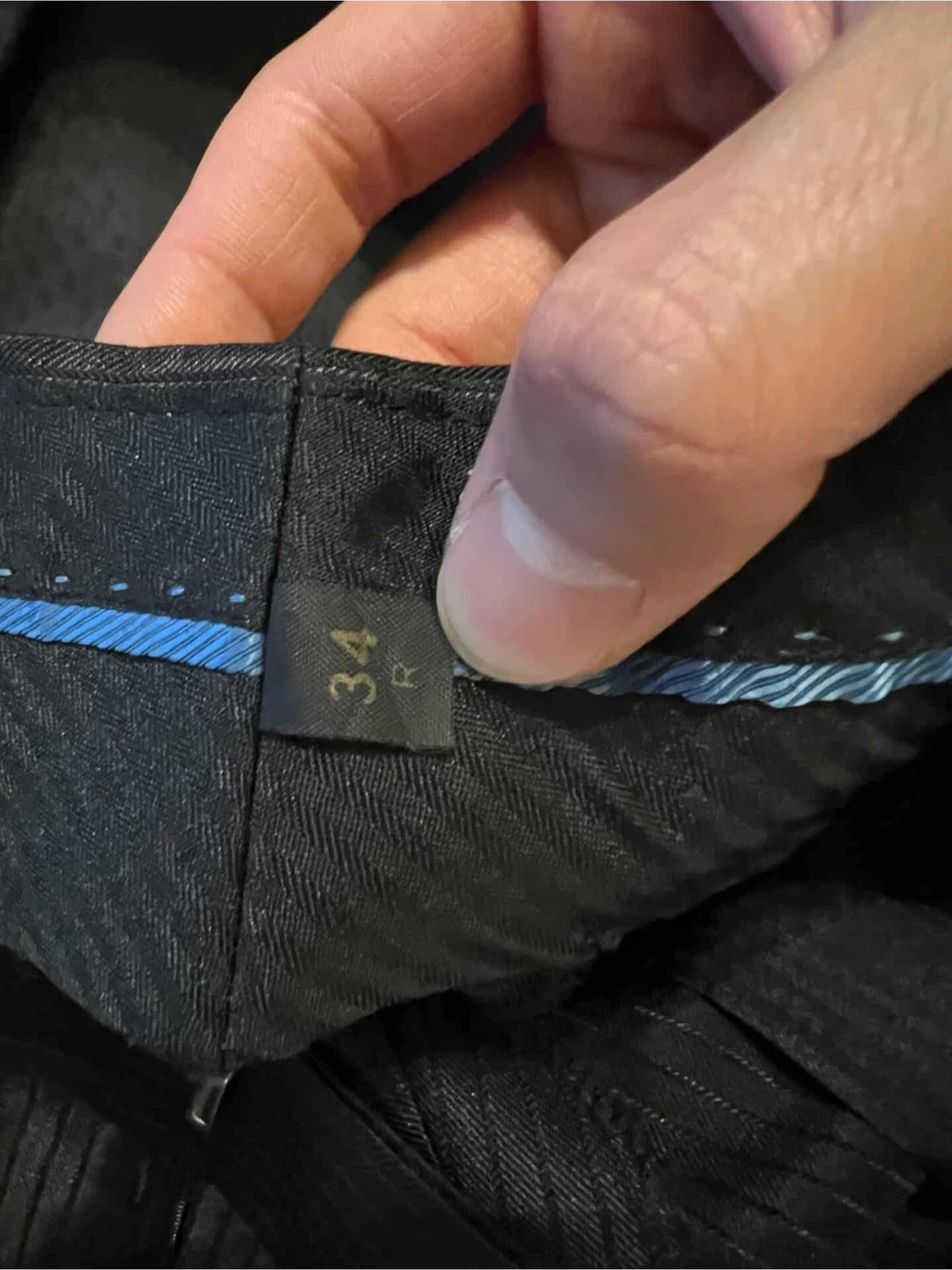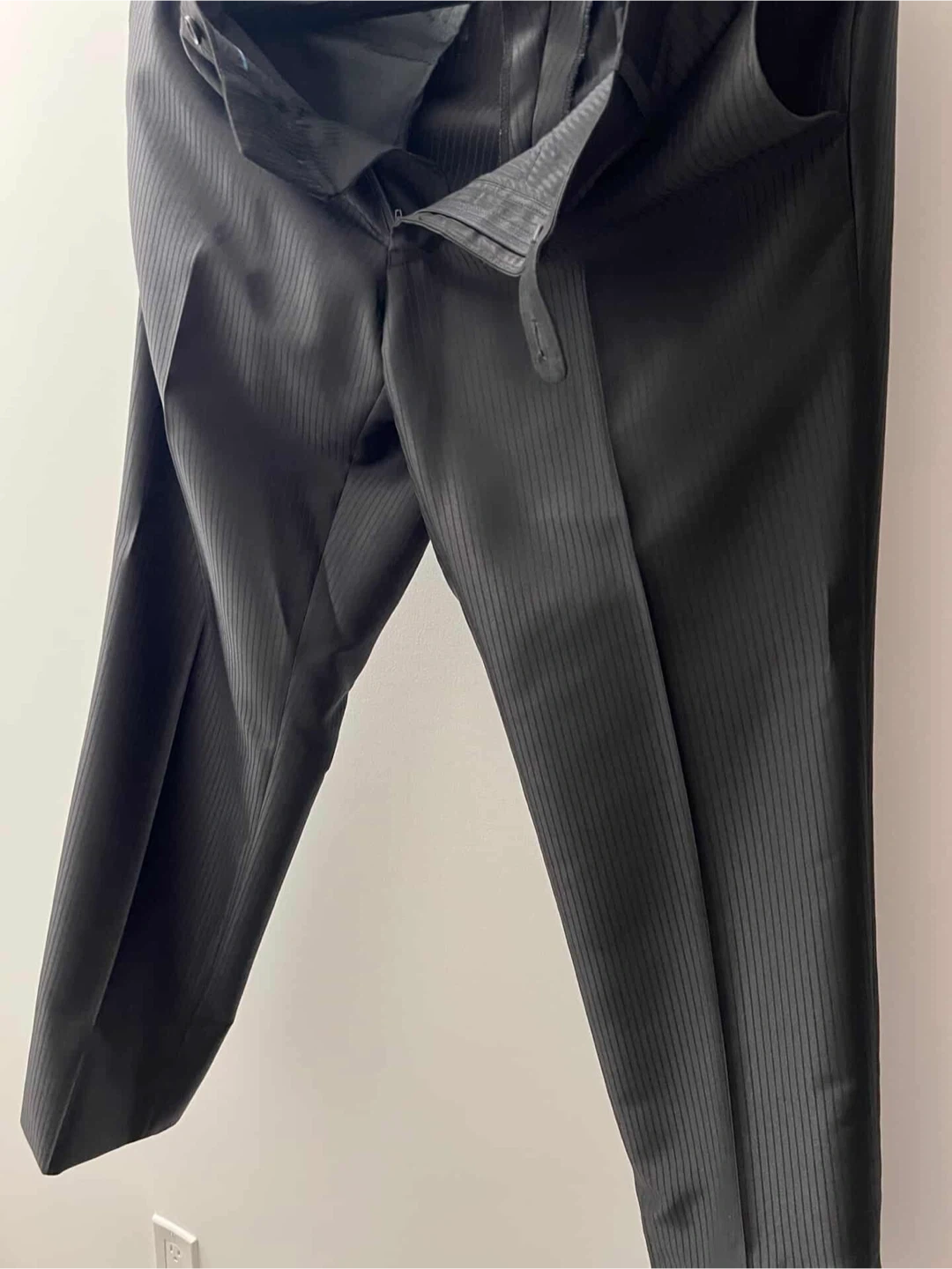 Selling a men's black suit with a subtle pinstripe pattern. It's a size 40R for the jacket and 34R for the pants. This suit is suitable for formal occasions or professional wear.