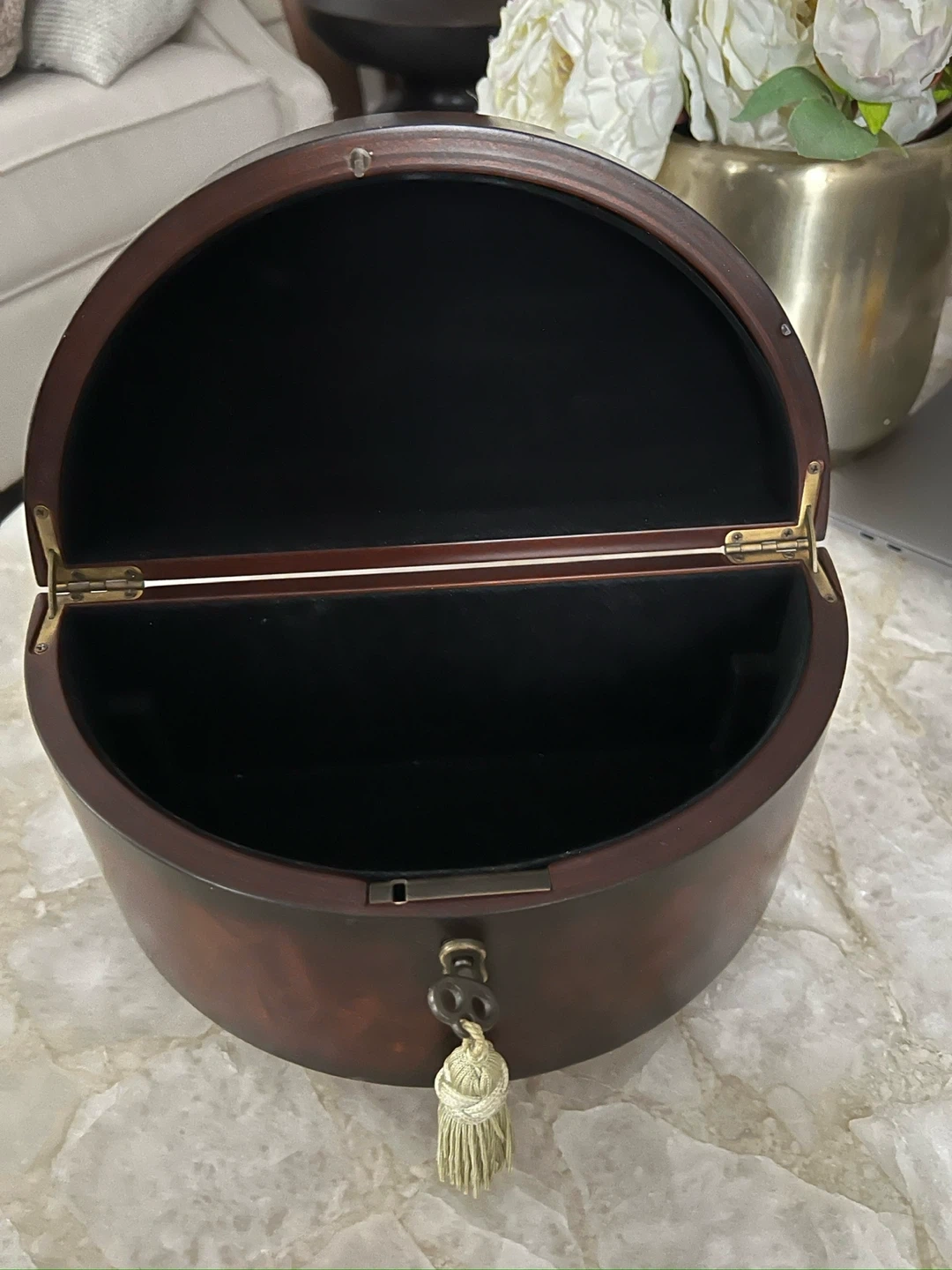 This oval-shaped wooden box features a dark, polished finish and a decorative brass clasp with a matching tassel. It's lined with black fabric, perfect for storing small treasures or keepsakes. The hinged lid secures with a lock and key.