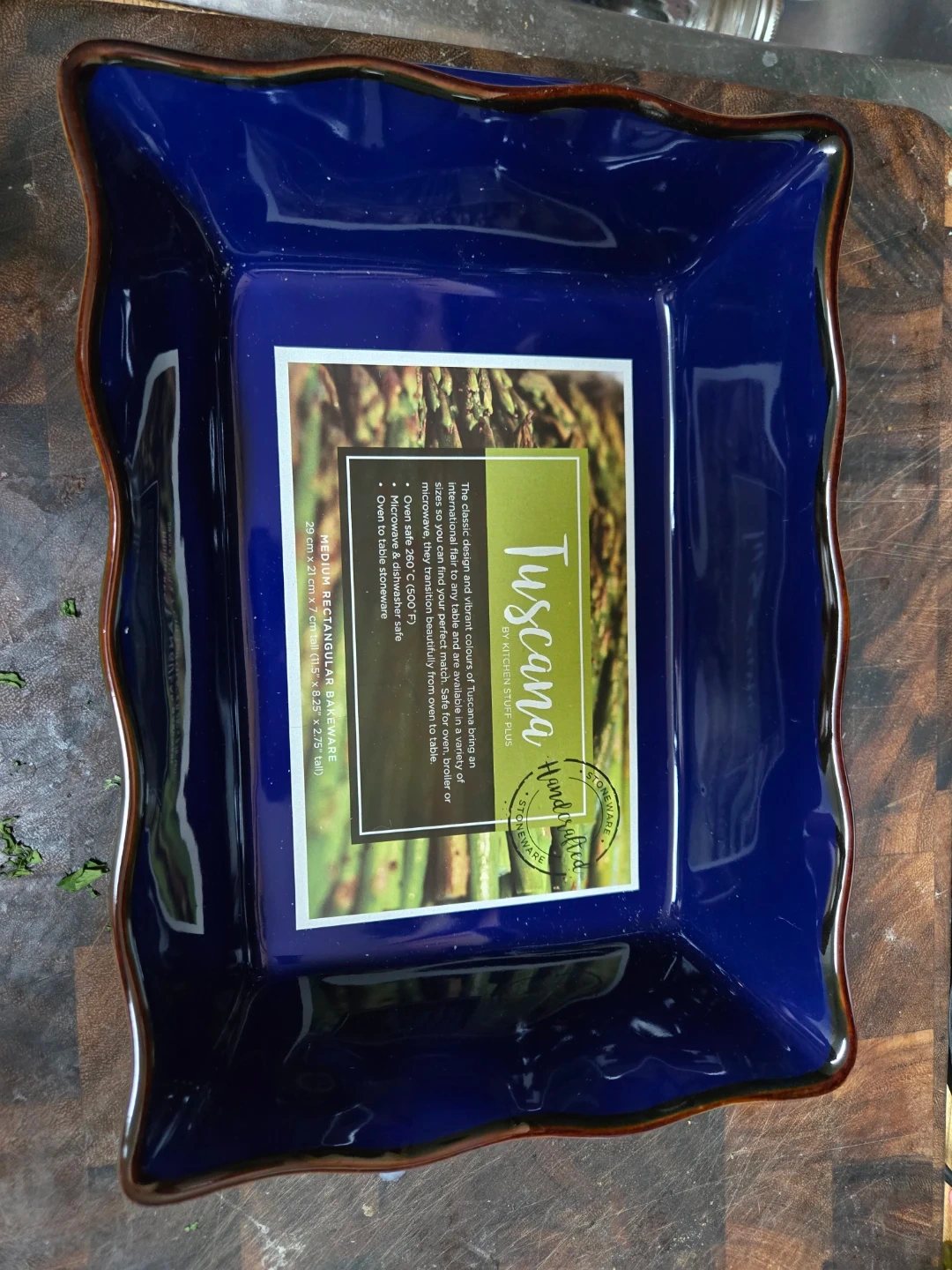 Selling a Tuscana rectangular bakeware dish in a lovely navy blue colour! It's oven safe up to 260°C (500°F) and also dishwasher safe for easy cleaning. The dimensions are 29 cm x 21 cm x 7 cm (11.52 in x 8.27 in x 2.76 in)