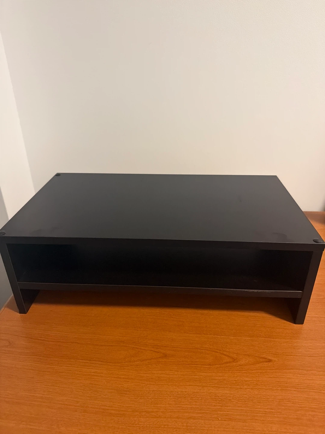 Selling a black monitor stand riser. It's in great condition and ready to help organize your workspace! It has a shelf underneath for extra storage