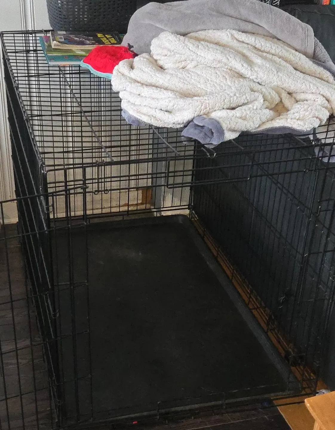 This is a large wire dog crate that comes with a black plastic tray. It's made of durable wire and has a secure latch. This crate would be useful for training or safely containing your pet.