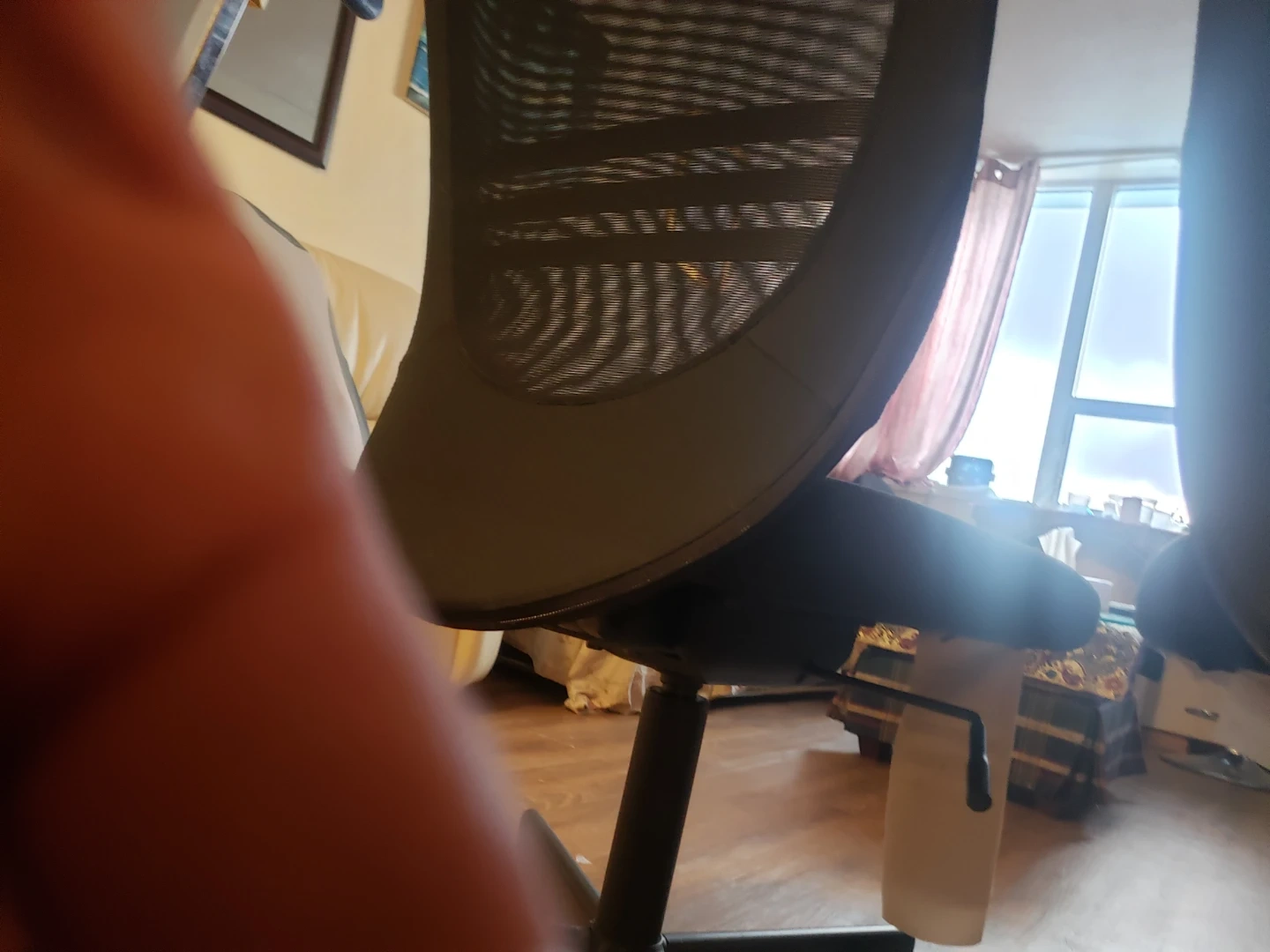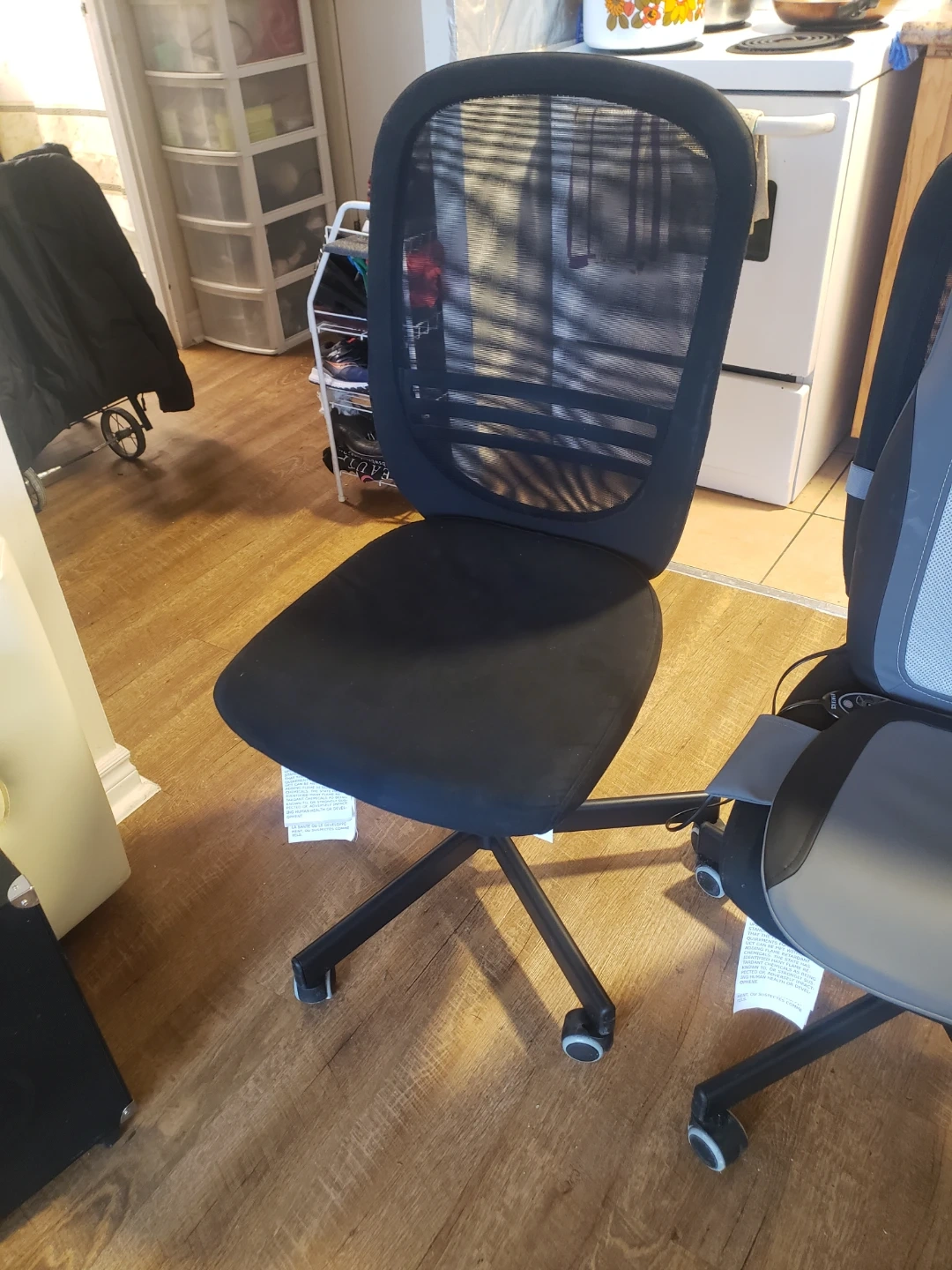 These are two black mesh office chairs. They have a comfortable mesh back it is adjustable up and down and . They're on wheels for easy movement. Perfect for a home office or study space!