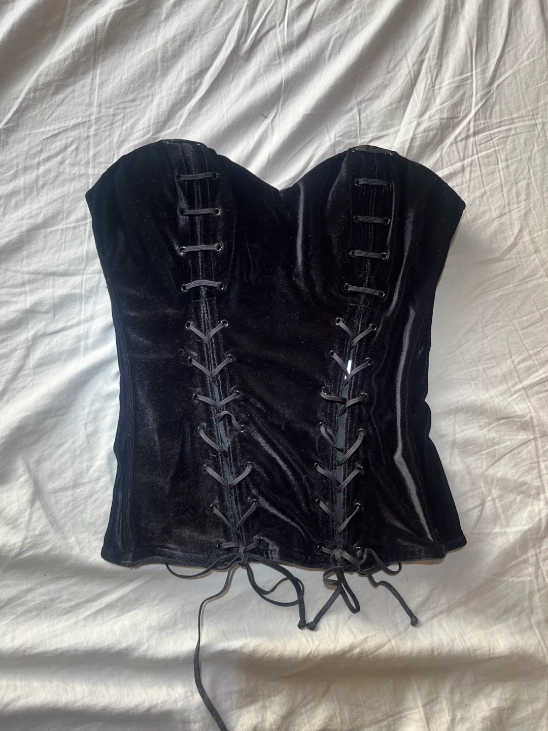 This black velvet corset features front lacing detail. It's made of a soft velvet material. This piece is great for layering or as a statement top!