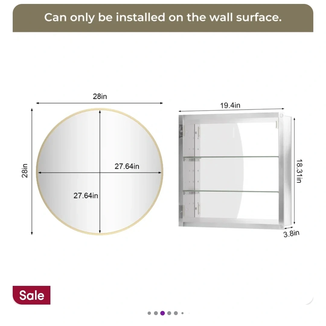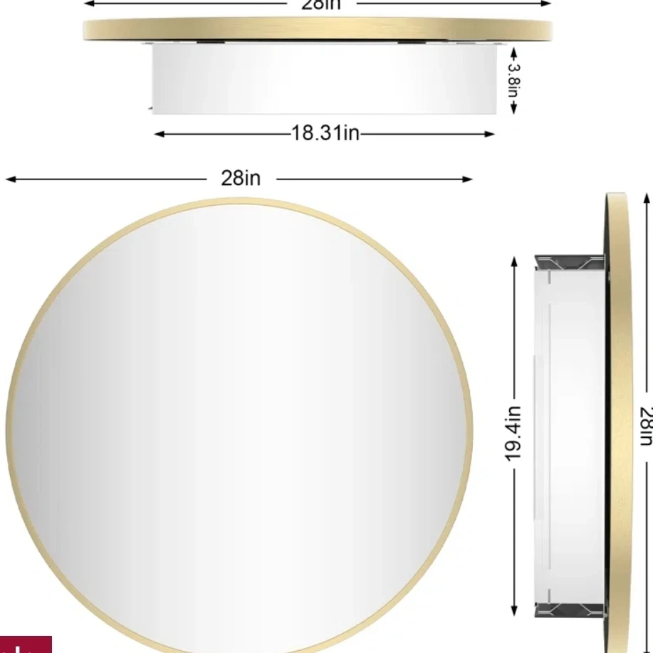 15Selling a stylish 28-inch round bathroom mirror with a gold frame! It also functions as a cabinet, providing extra storage space. The dimensions are 28 inches in diameter and 19.4 inches in height. It's designed to be installed on the wall surface Retail value 350