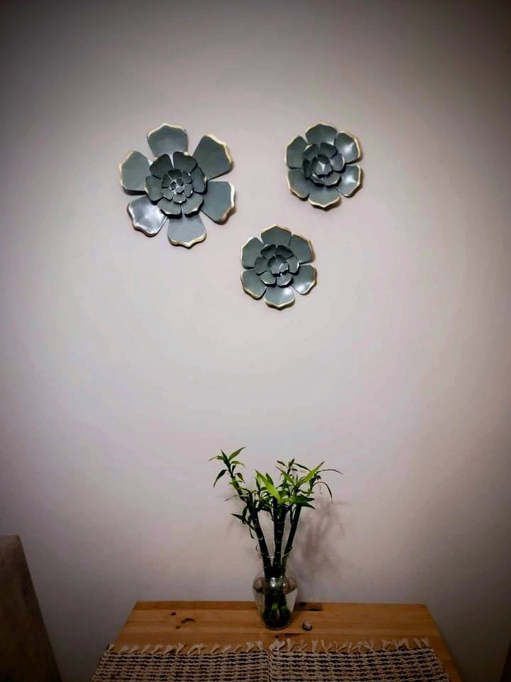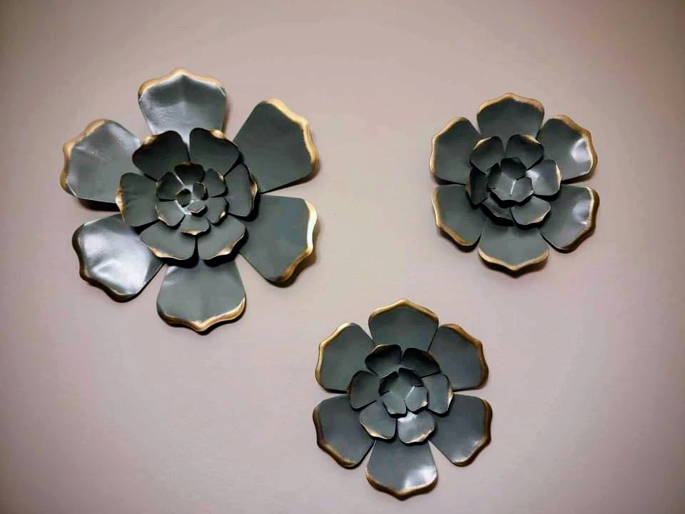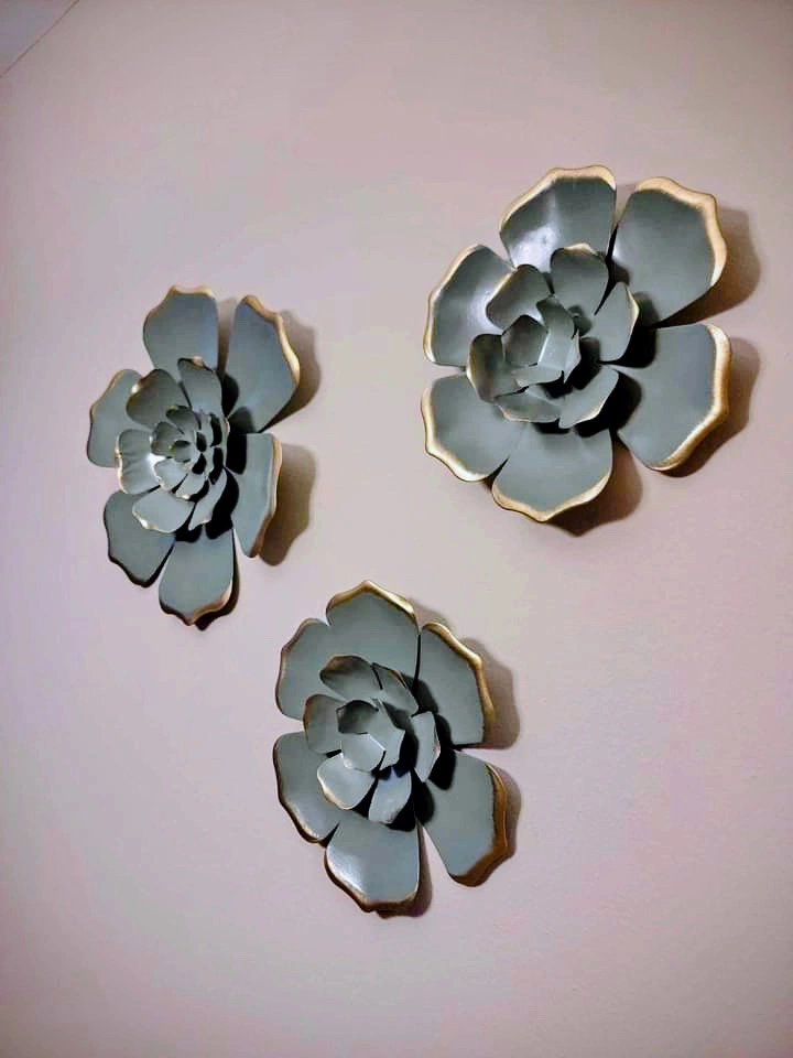 Enhance your living space with a touch of elegance and charm with our stunning set of metal flowers. These handcrafted, gray-blue blooms are beautifully accented with gold trim, adding a sophisticated flair to any room. The set includes three flowers in varying sizes, designed to be easily hung on your wall for a striking display. Perfect for adding a unique, artistic element to your decor, these flowers will brighten your home and make a lasting impression. Transform your walls with the timeless beauty of metal art!