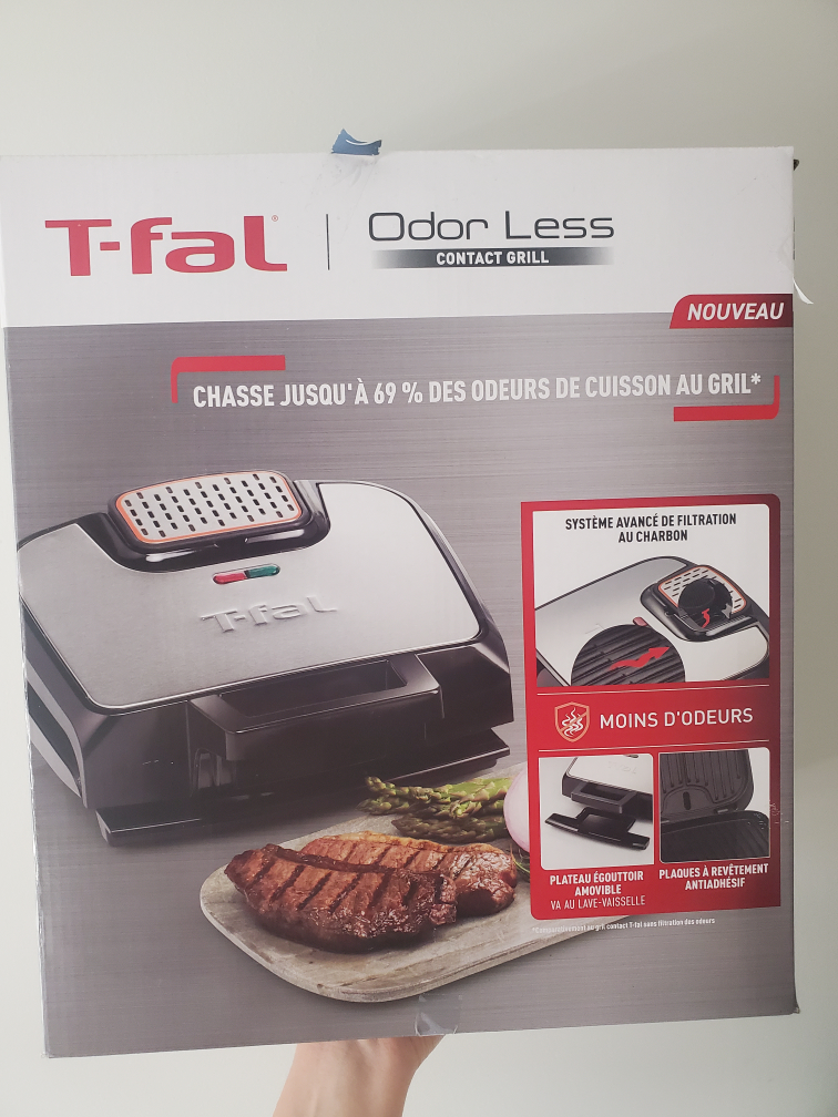 T-fal Odorless Contact Grill with charcoal filtration system. Includes removable drip tray. Plates are non-stick and dishwasher safe. Brand new and unopened.