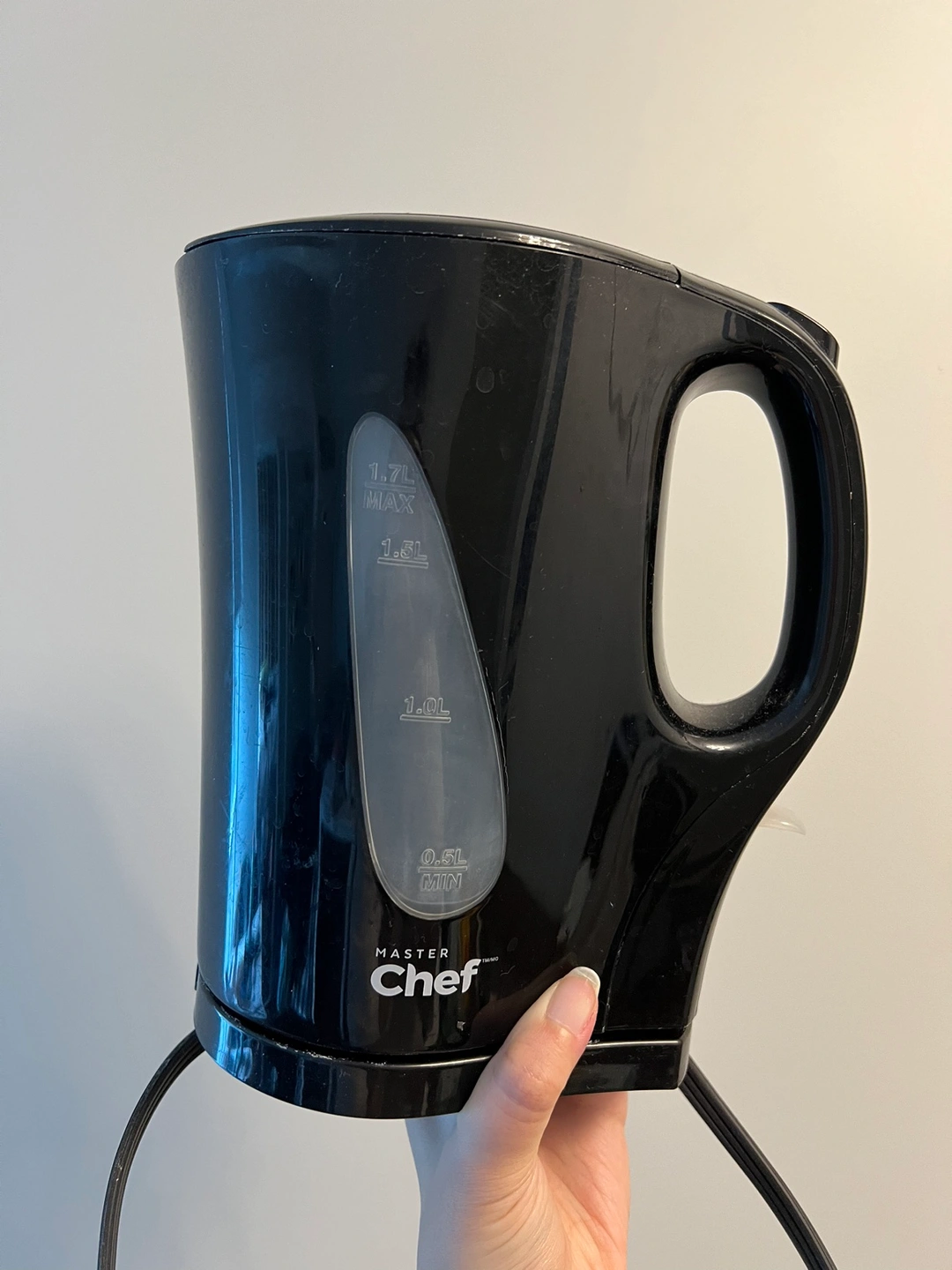Black electric kettle with a 1.7L capacity.