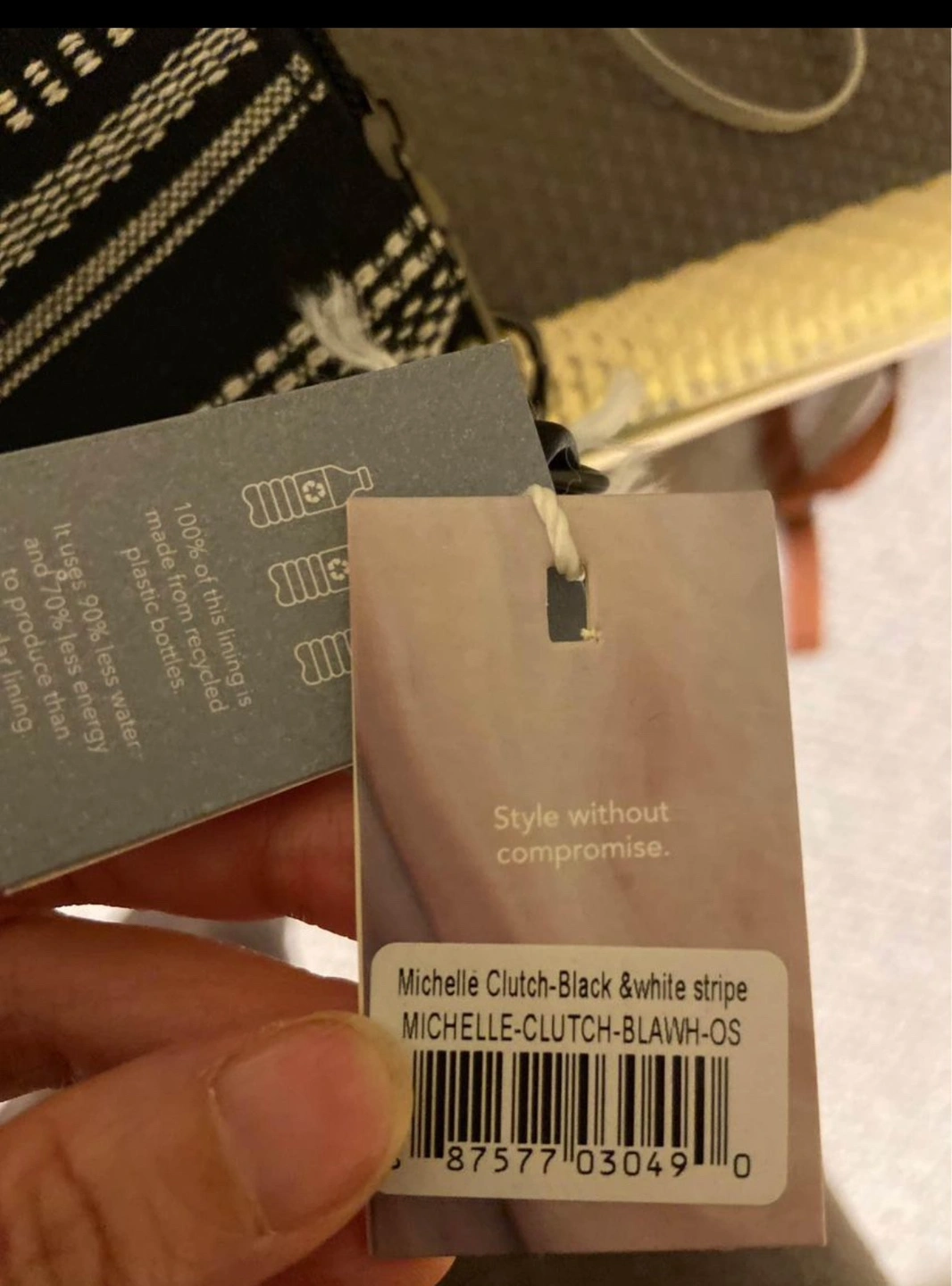 Black and white variegated woven cotton design. Black vegan leather detachable crossbody strap with a long tassel on the zip. Interior coin zip and card slots. Lining made from recycled plastic bottles.