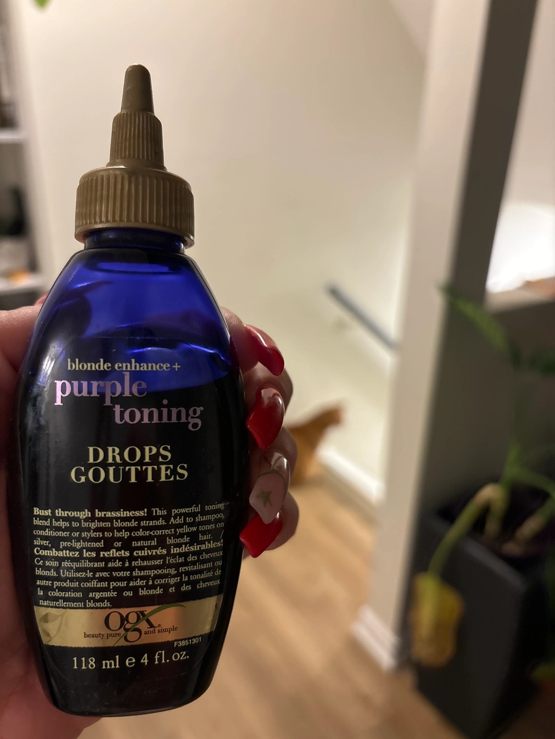 This is a bottle of OGX Blonde Enhance + Purple Toning Drops. The bottle is about 80% full. No longer have blond in my hair so I don’t need it.
