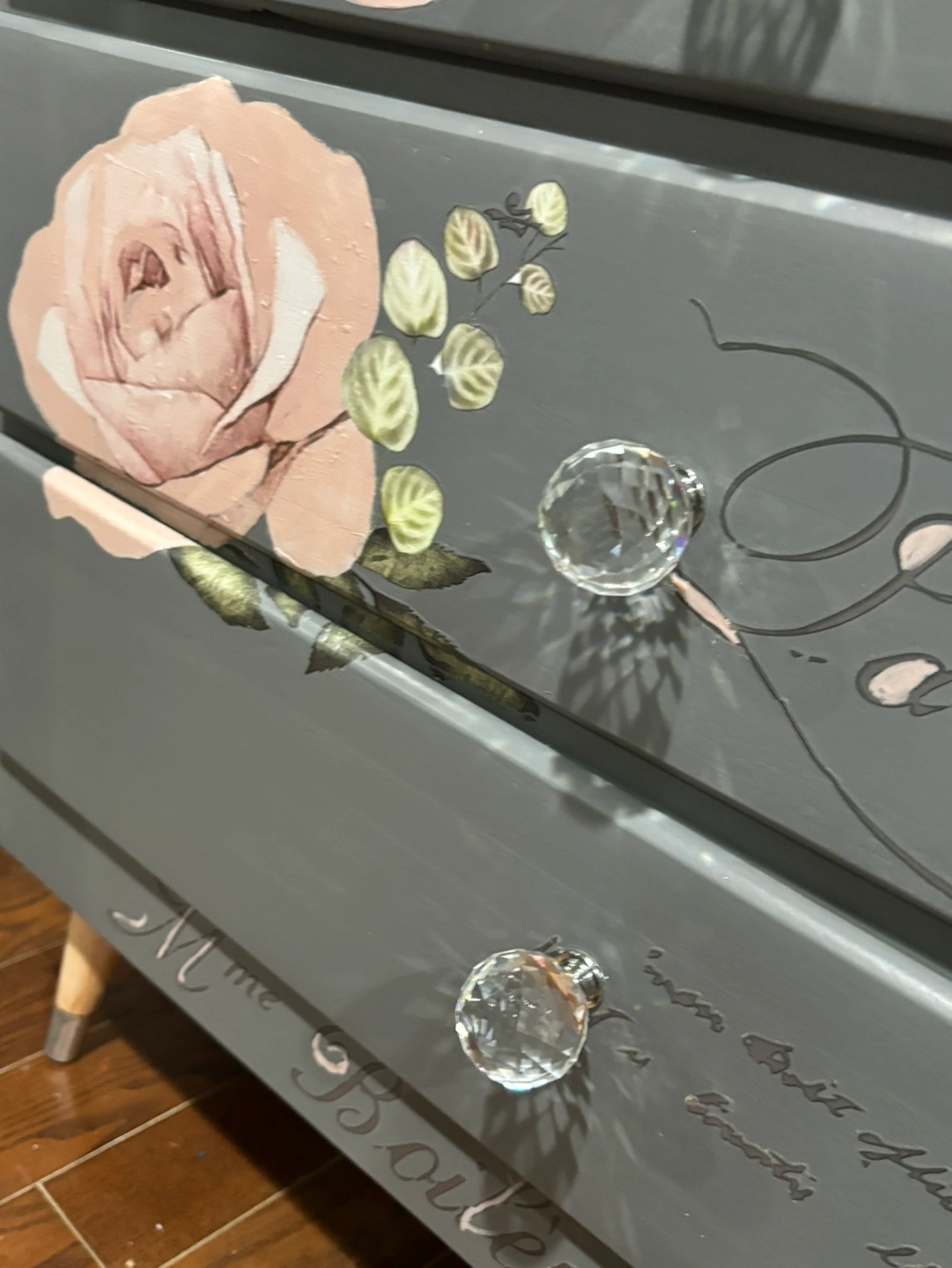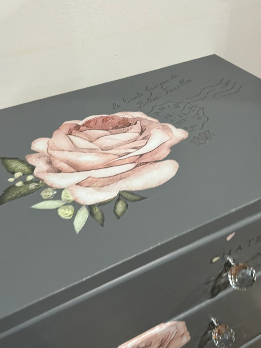 Floral with Parisian script writing painted in grey .drawers open n close .smoothly original legs sanded to natural wood grain and redone in silver .Painted in a non smoking studio .free delivery