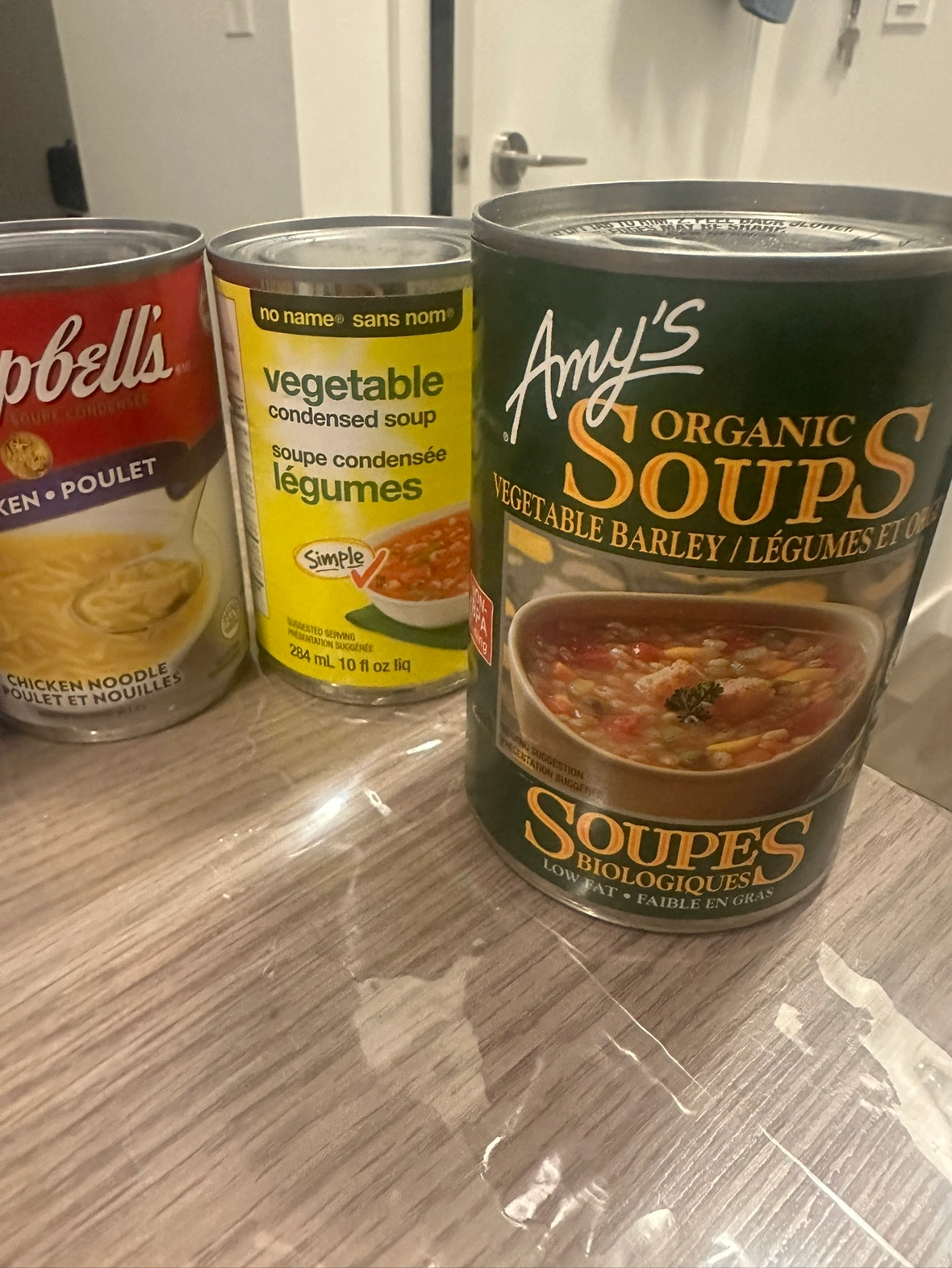 Buy & SellFoodFoodFreeThree cans of soup. One is Campbell's Chicken Noodle, one is no-name vegetable, and one is Amy's Organic Vegetable Barley. One KD original pastaWHERE TO MEETEglinton youngView MapSELLERAliciaYonge Eglinton52551 reviews1 chats·0 favorites·49 viewsSEND CHAT TO SELLERHi Alicia! I’m interested in your listing.Hi Alicia! I’m interested in your listing.Get the Karrot app to chatSign In to chat