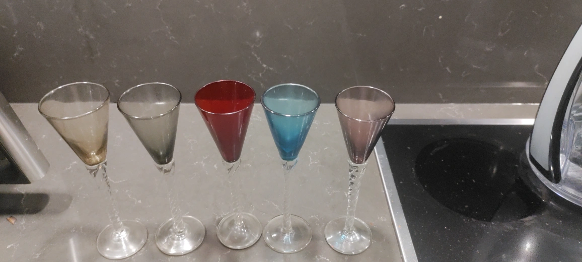 5 beautiful vintage glasses with a twisted stem, perfect for cocktails or liqueurs. The glasses are coloured with a clear base. Two are a light grey, two are dark grey, one is red and one is blue.