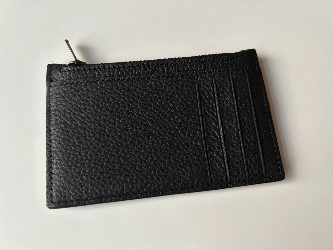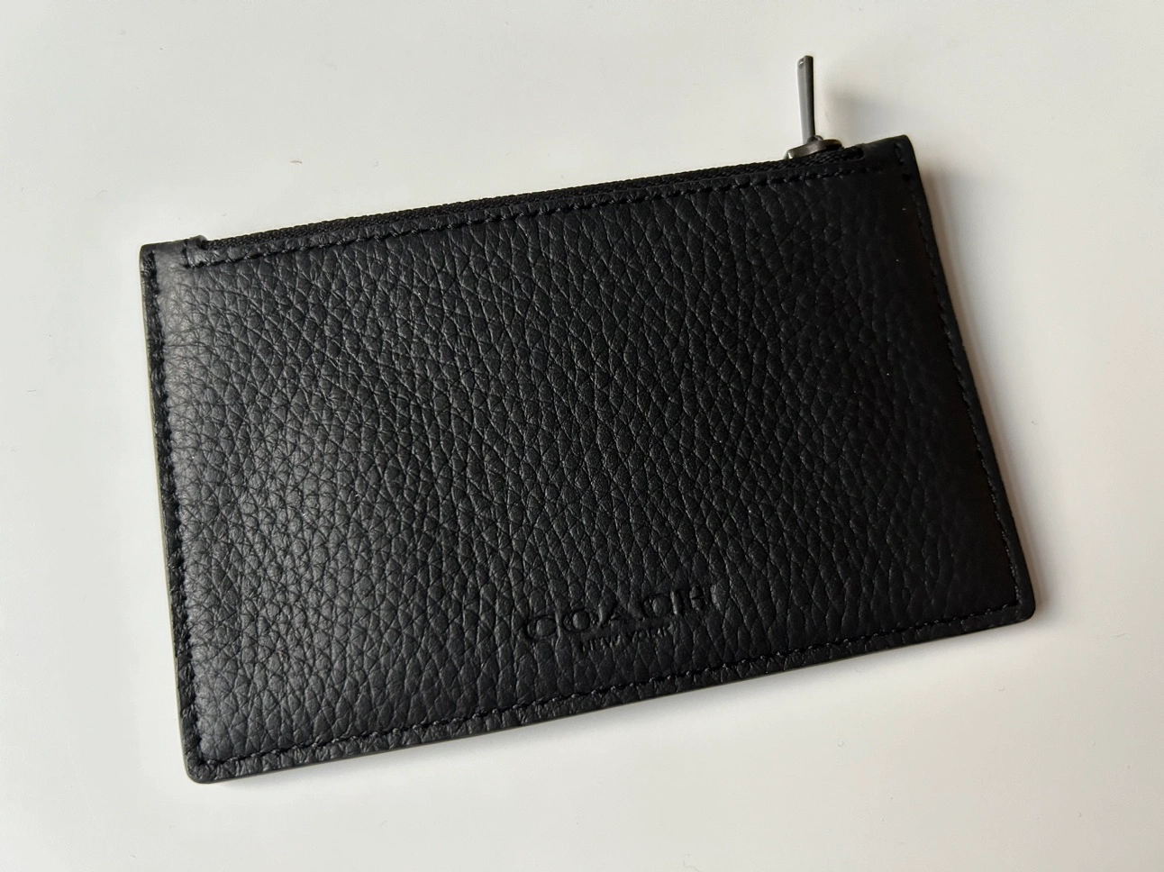 Black leather zip card case with Coach logo on the front. This card case features a zipper closure and multiple card slots.