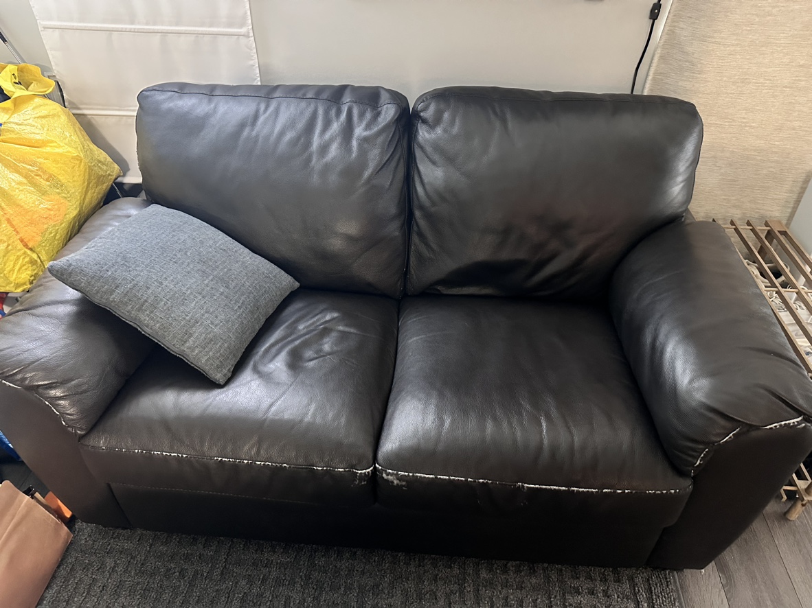 Moving out sale. This love seat is a great addition to any living room. It is comfortable and stylish, and perfect for relaxing after a long day. It features a classic design with a luxurious leather finish. The love seat is in good condition. Two seater couch. Ideal for a 1 bedroom/ studio apartment, fits just fine. 150 CM x 90 CM
