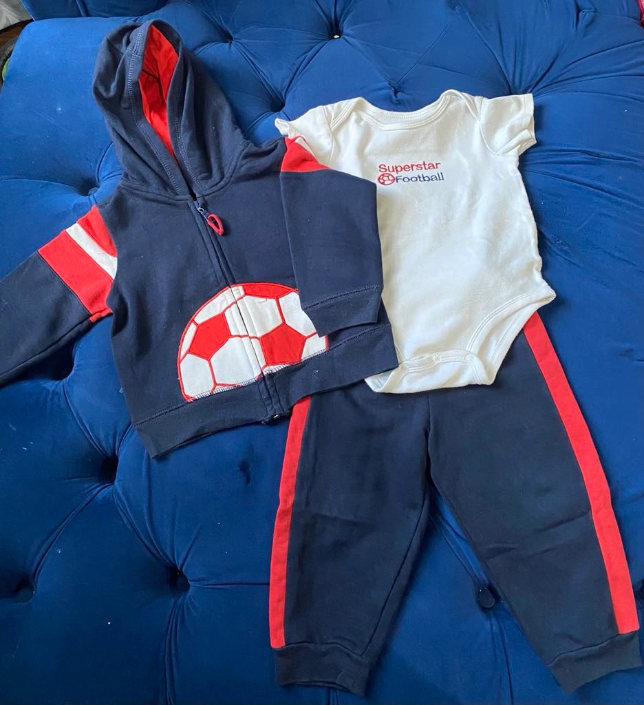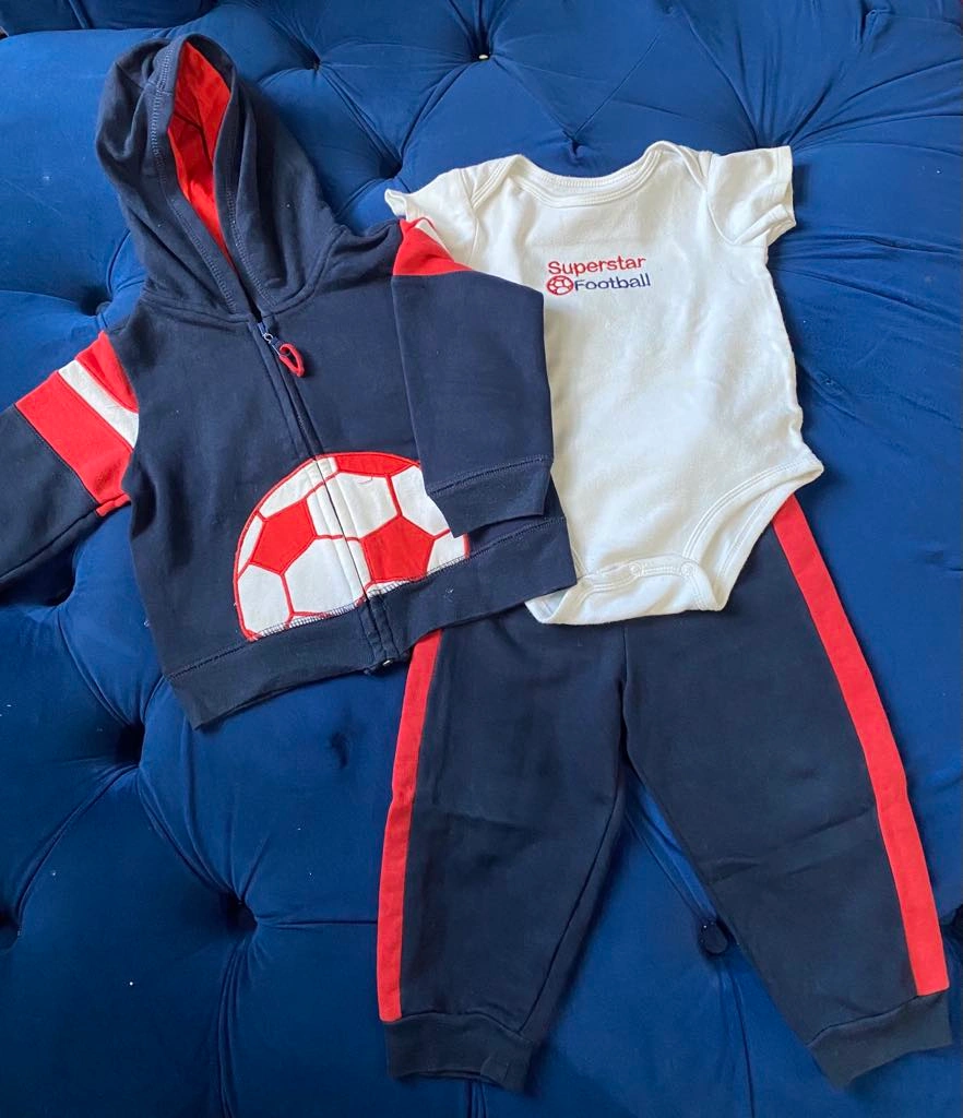 This outfit comes with a hoodie, a bodysuit, and pants. It has a soccer theme with red accents. size 18 months.
