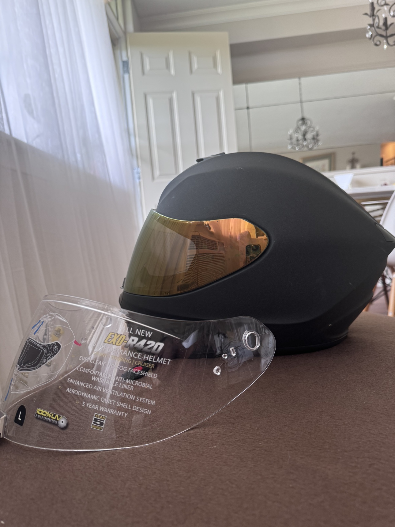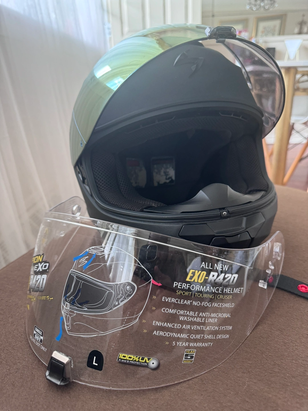 Used Scorpion Exo-R420 helmet with gold visor and clear shield. (Comes with helmet bag)