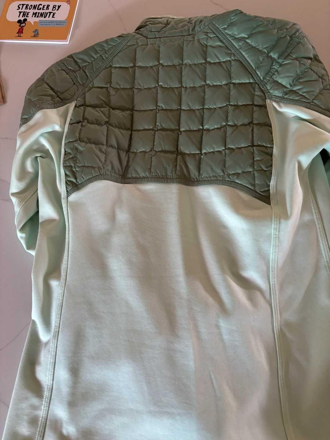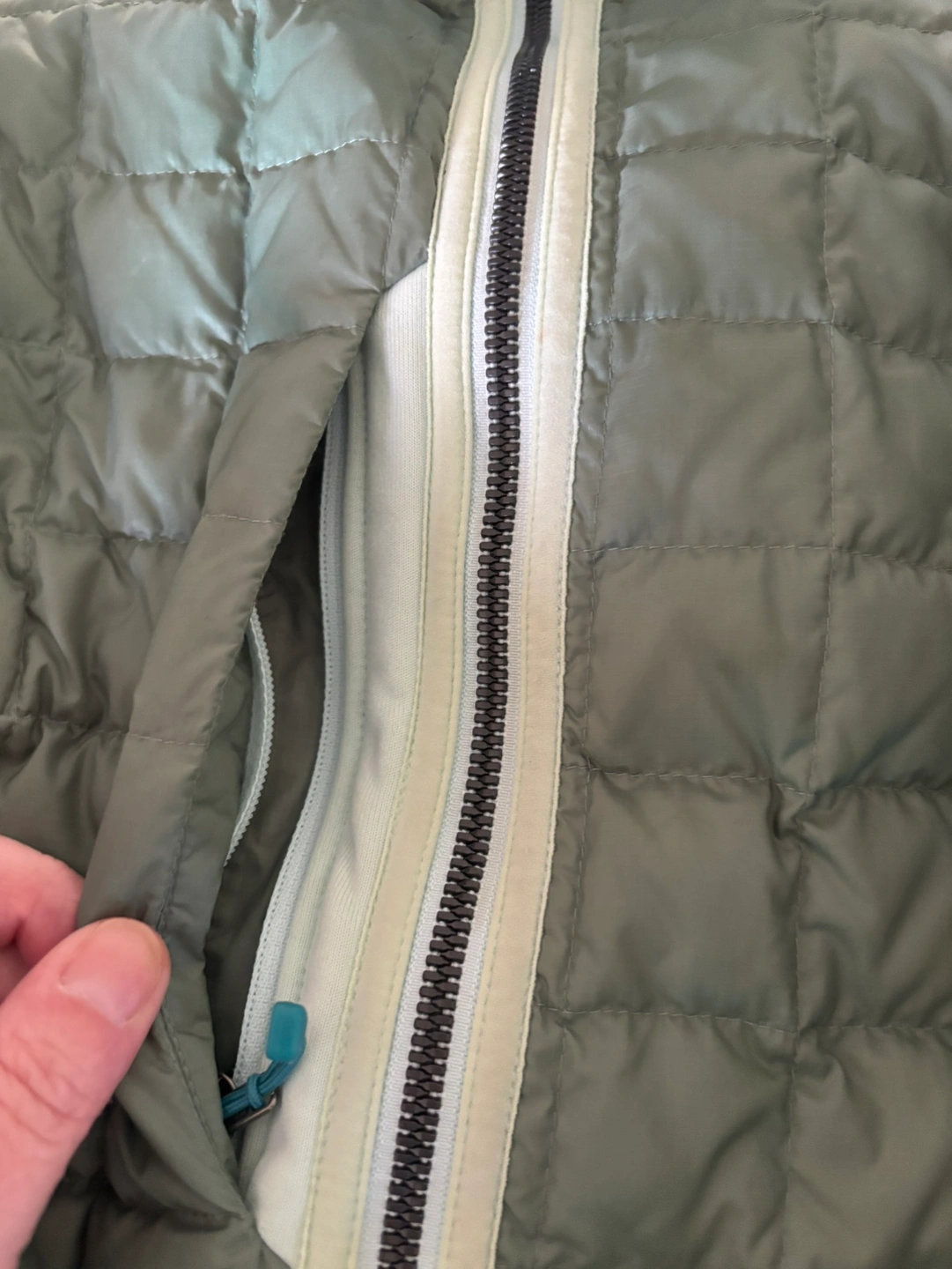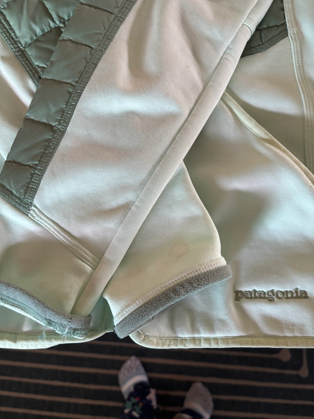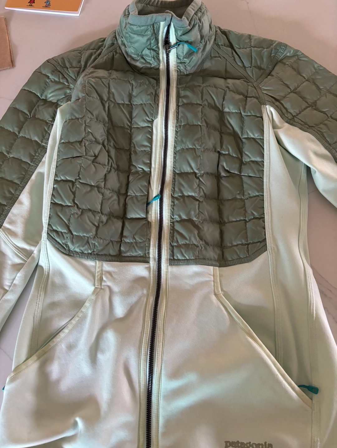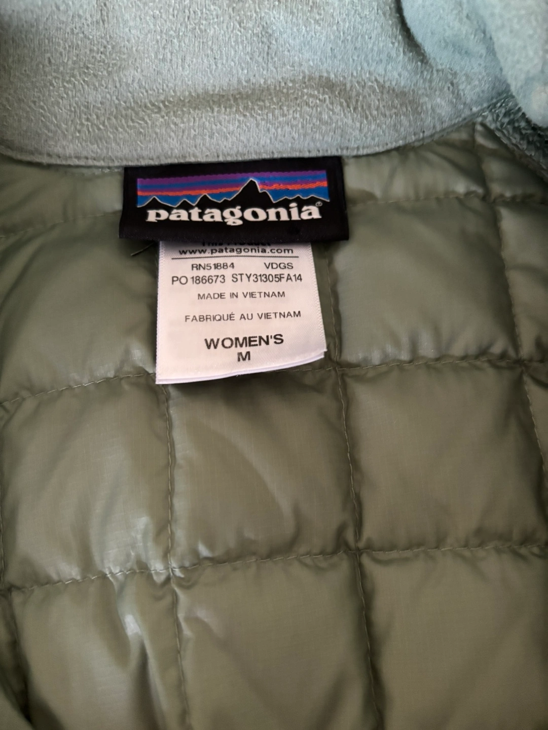 This is a Patagonia women's jacket. It is green and insulated. It has a zipper closure and two pockets. The tag says size M. It is in amazing shape and Patagonia has the best return policy if the zippers break or it rips Pick up Etobicoke