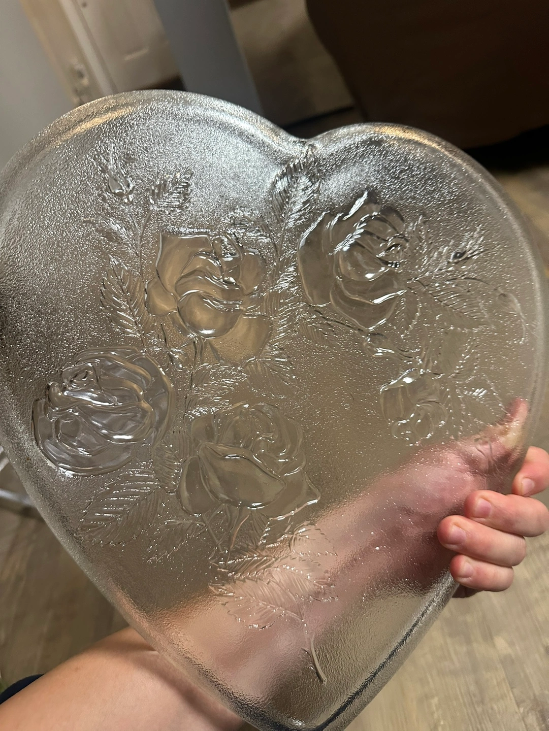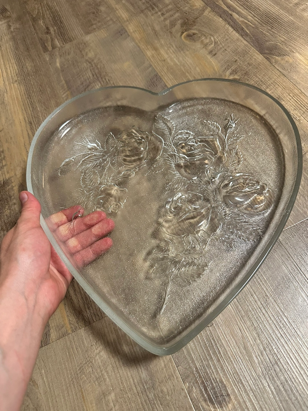 A beautiful heart-shaped serving tray with a raised rose design. It is made of clear glass and would make a lovely addition to your kitchen.