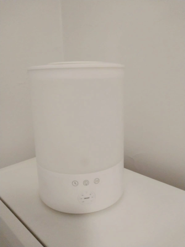 White humidifier with a light. It has a digital control panel with 4 buttons. The humidifier is round and has a big water tank. It has timers.