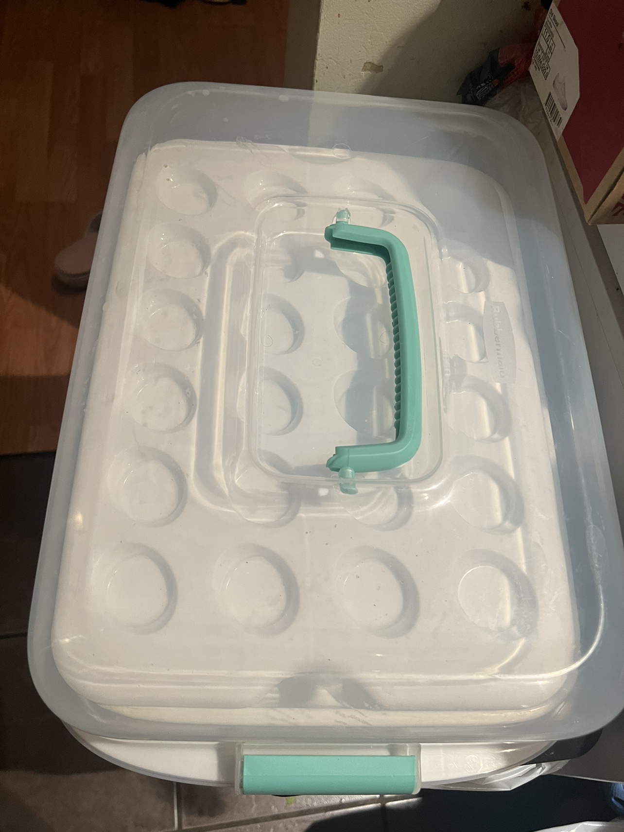 Kit can carry sheet cake, deviled eggs/mini muffins, 4 compartment snack tray with sealed dip container, locking lid This set includes a storage container with a lid, two trays and a divided tray. I It is perfect for transporting cupcakes, muffins or other baked goods. There are 24 individual spaces for cupcakes on the trays. The divided tray is good for holding frosting, sprinkles or other decorations.pick up Lynn Valley North Vanvcouver