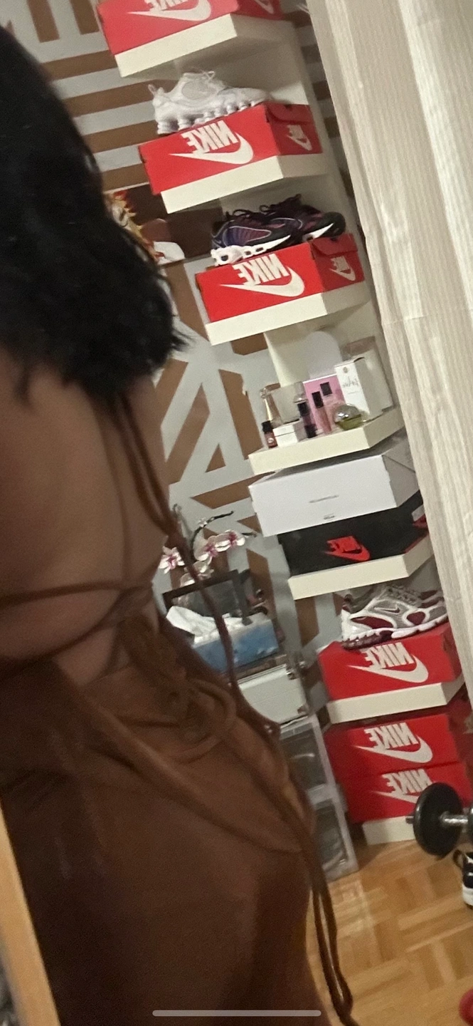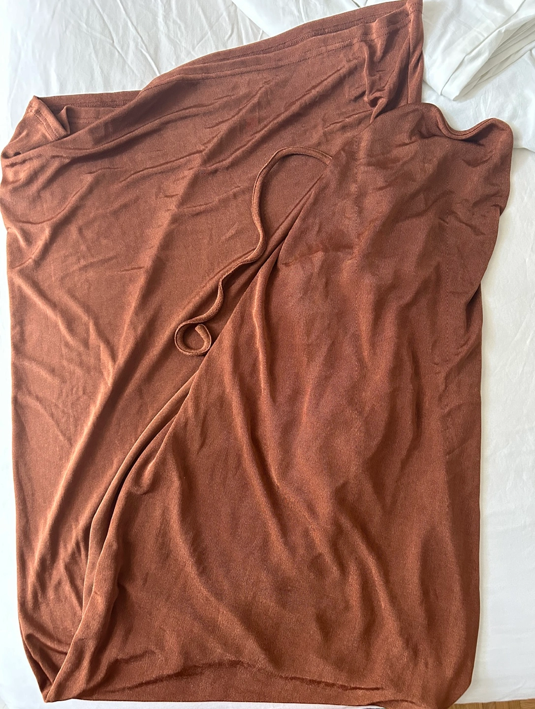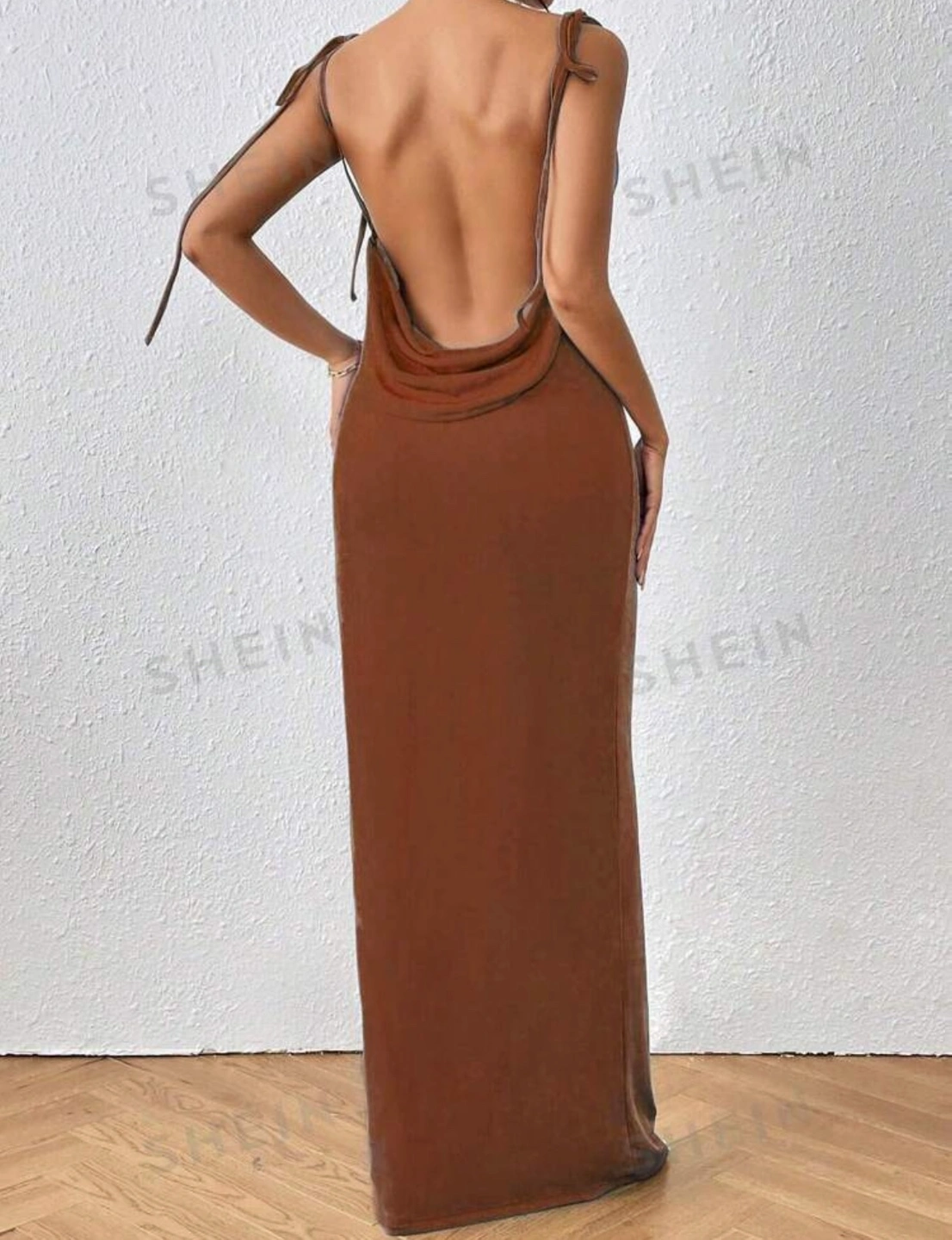 A long brown maxi dress with a low back and straps that tie at the neck. The dress has a high slit on one side. The fabric is stretchy and comfortable.