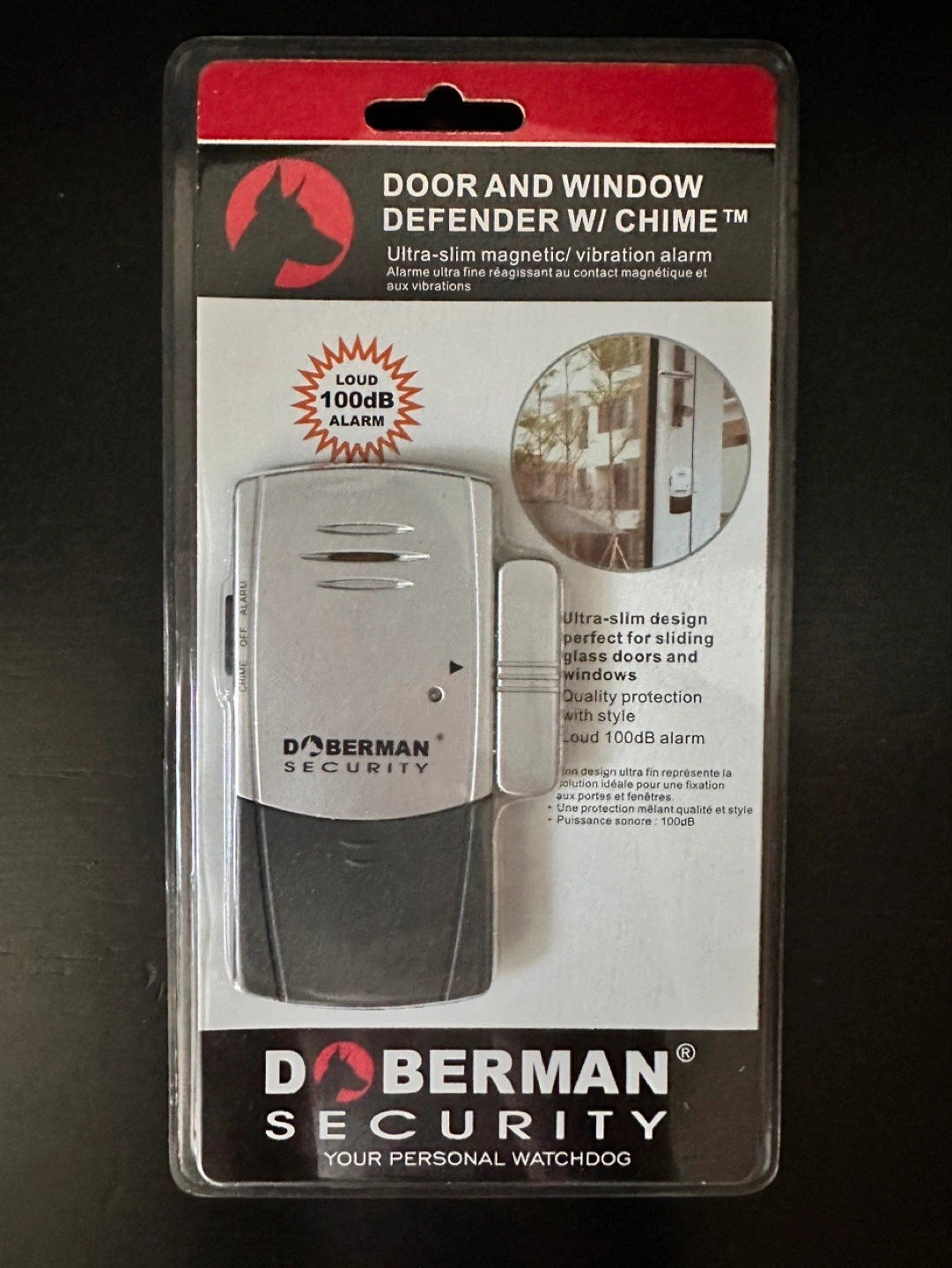 Doberman Door and Window Defender alarm with a built-in magnetic trigger and 100dB alarm