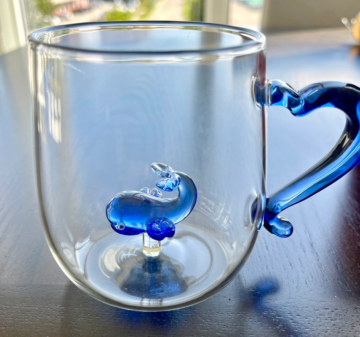 Glass mug with a blue whale inside. The handle is also blue glass. Perfect for tea or coffee. NEW comes with box.
