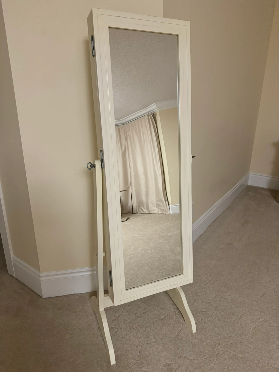 A beautiful adjustable ivory full-length mirror armoire with storage inside. It has a door with hooks to hang jewellery and shelves to store your things. It would look great in any bedroom.