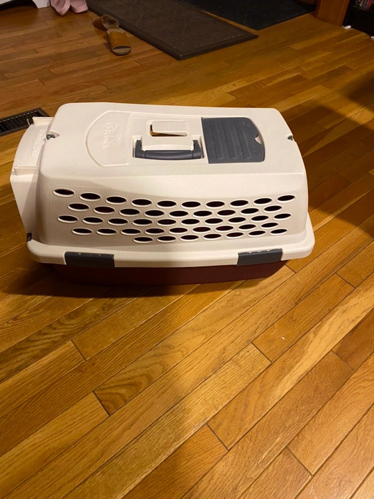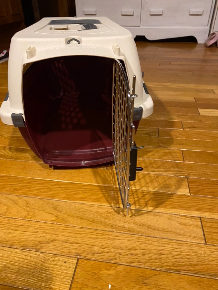 80Small dog or cat kennel, white and burgundy. Includes carrying handle and metal door. $45both 24” kennel