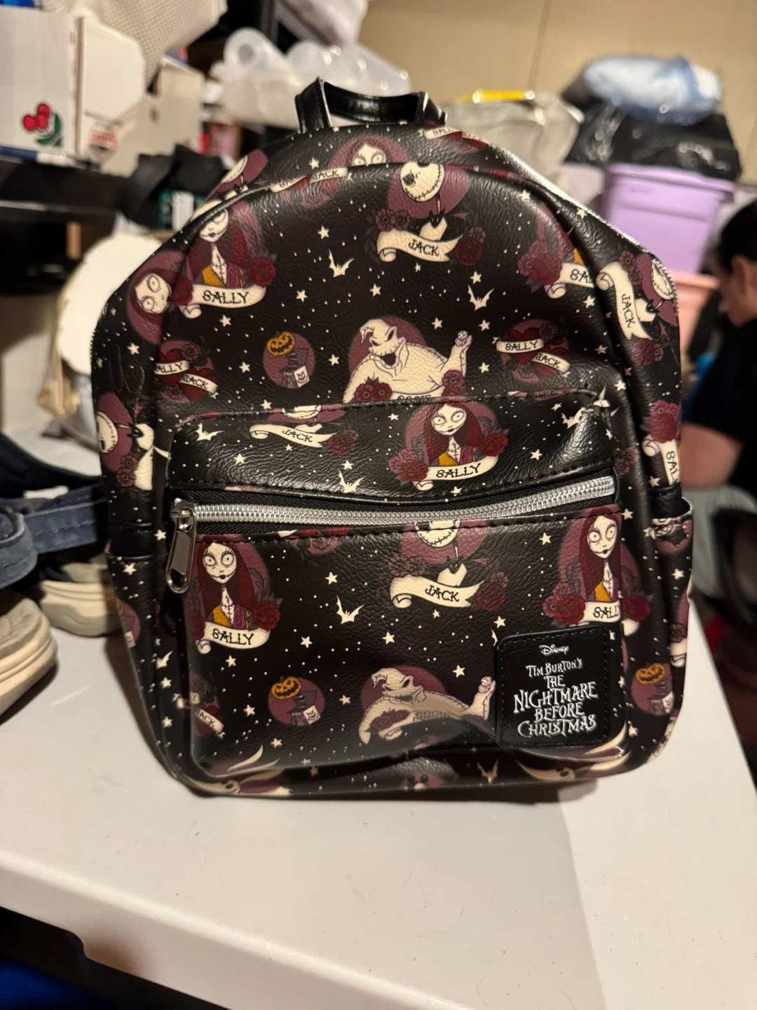 This mini backpack features characters from Tim Burton's The Nightmare Before Christmas. It's made of faux leather with a patterned design. Includes a front zipper pocket and adjustable straps.