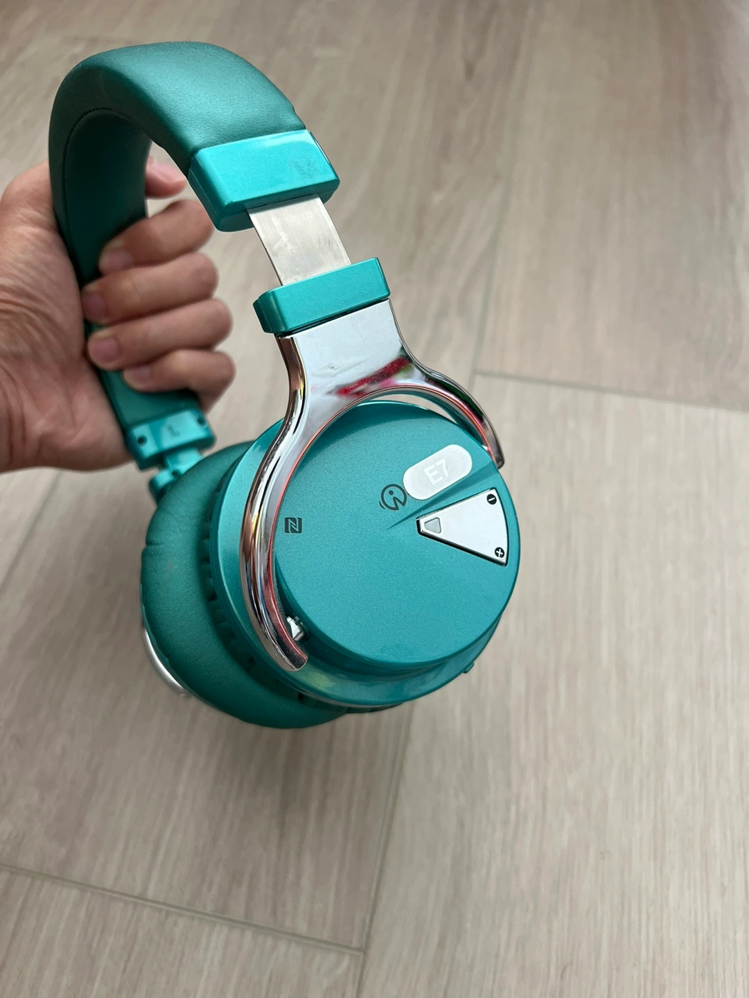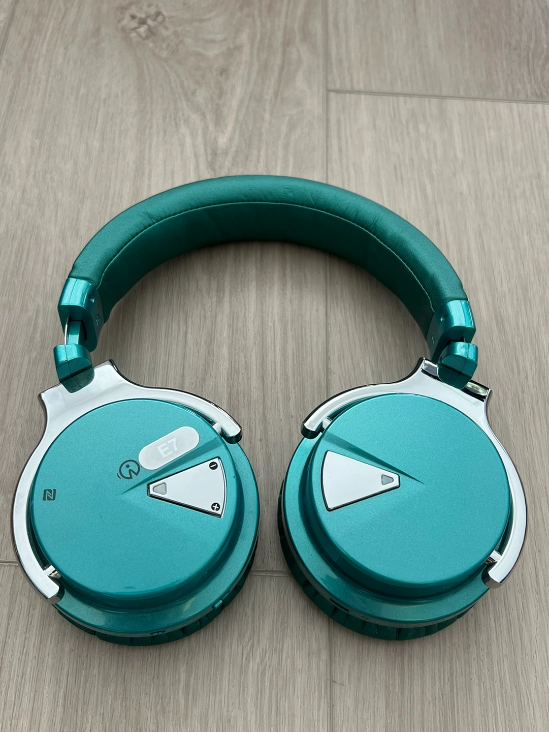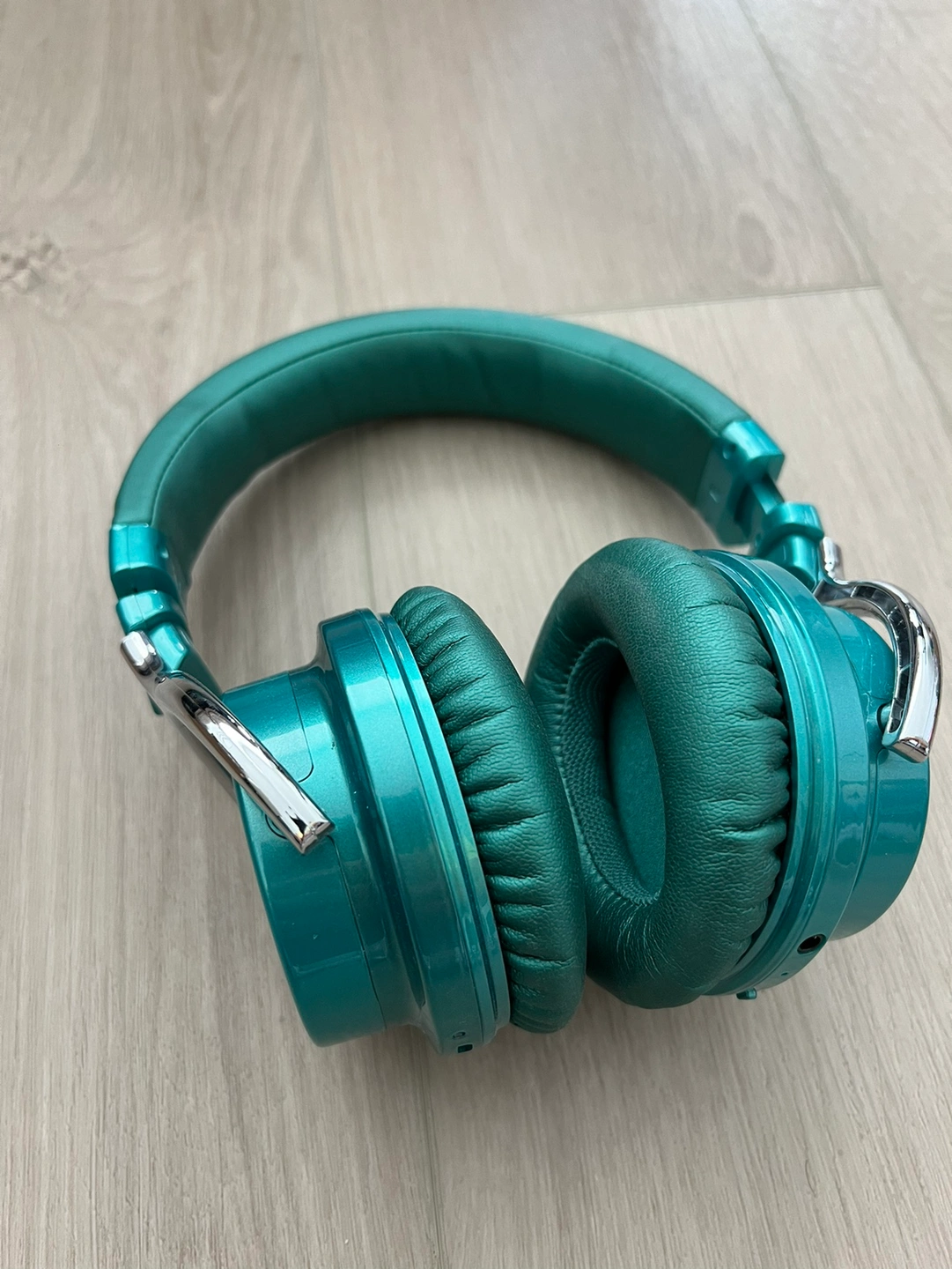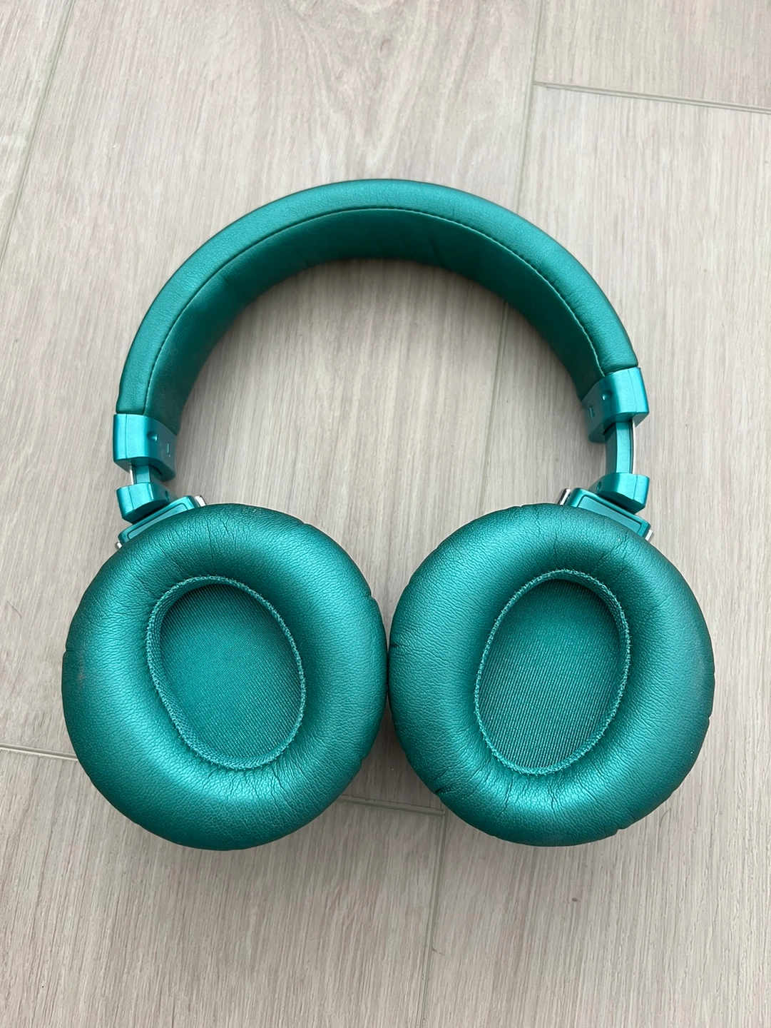 Teal wireless Bluetooth headphones with noise cancellation. Works perfectly well, I just have AirPods now.