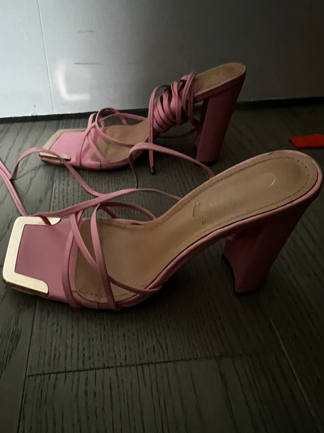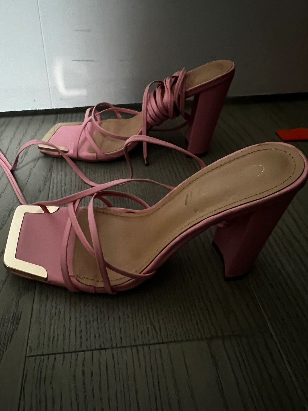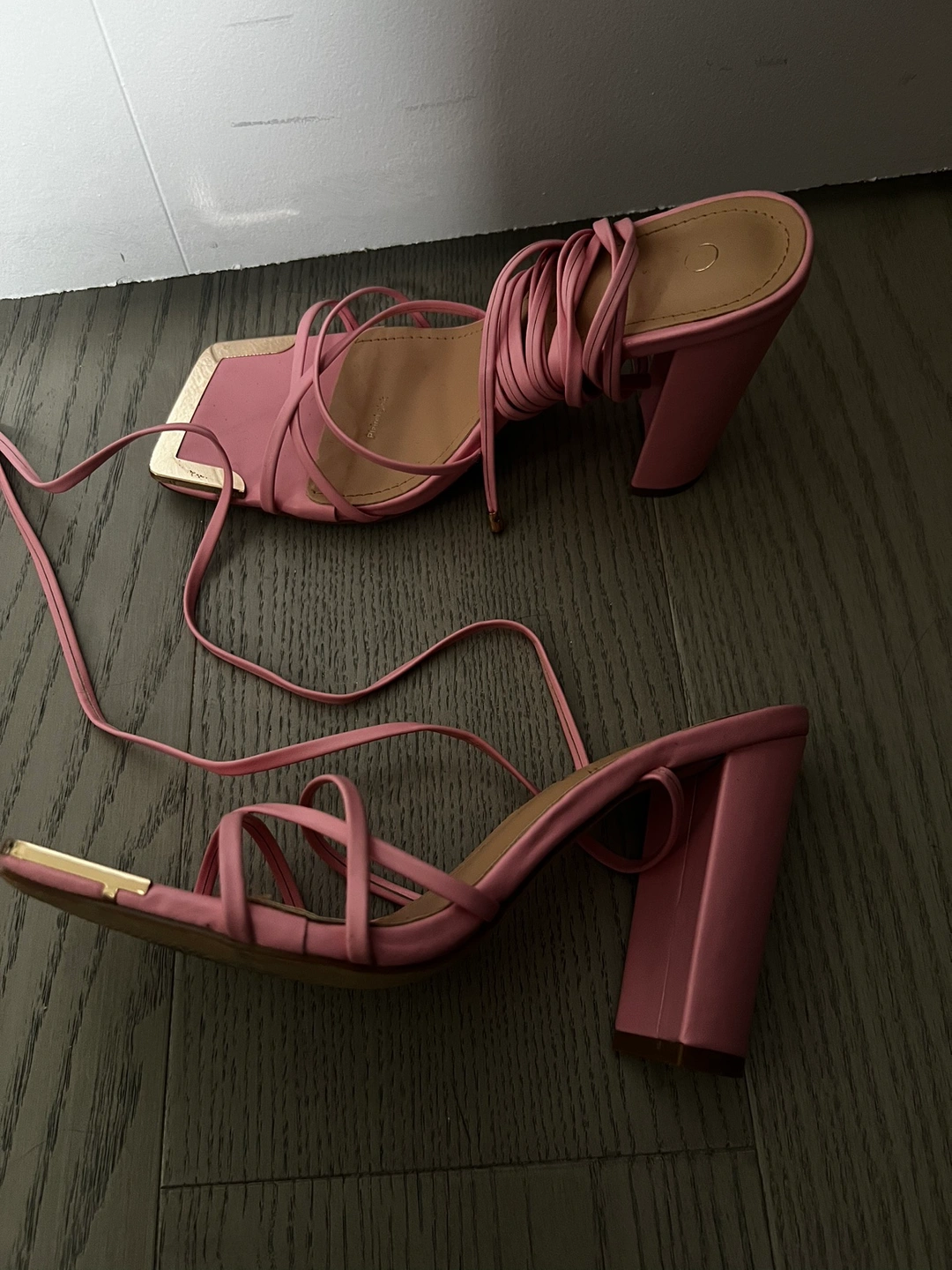 These are pink lace up heels with gold accents. They are in great condition! Would be a great addition to anyone's wardrobe!