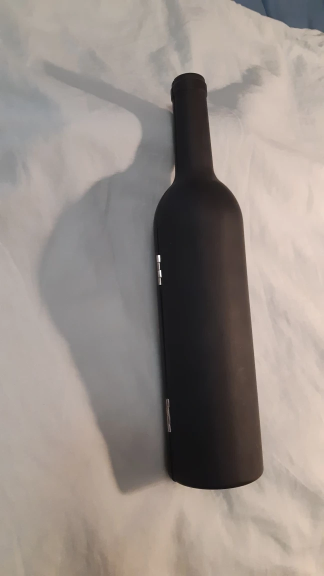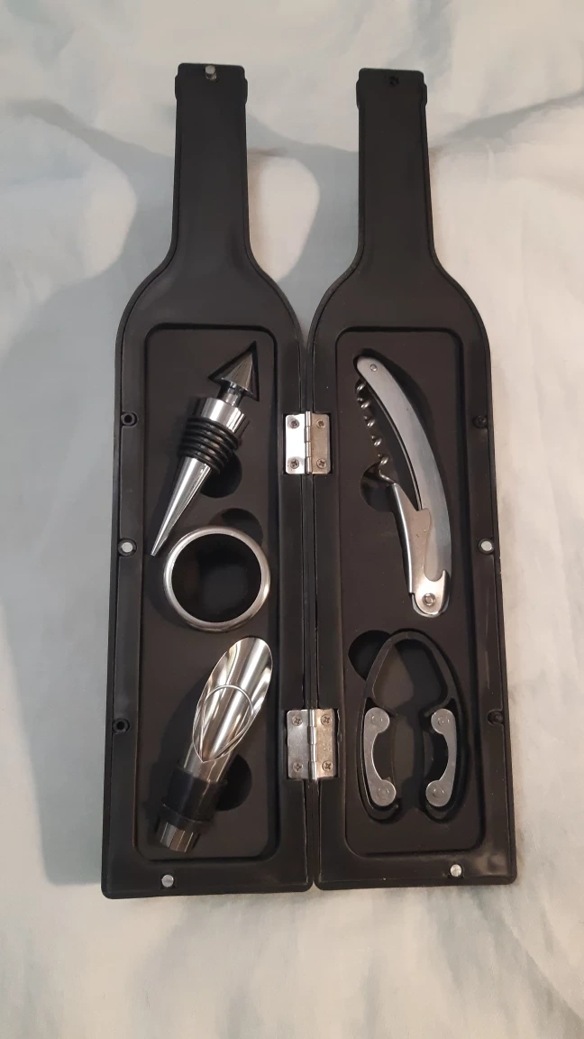 This wine bottle shaped box includes a bottle opener, a pourer, a stopper, and two bottle rings. can be displayed upright or kay with your wine in a wine rack. opens on the side