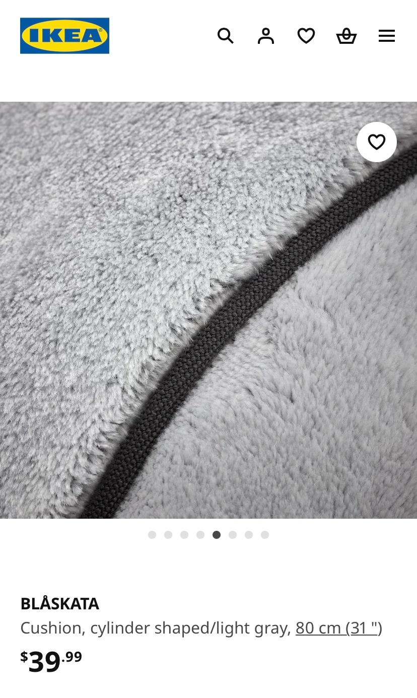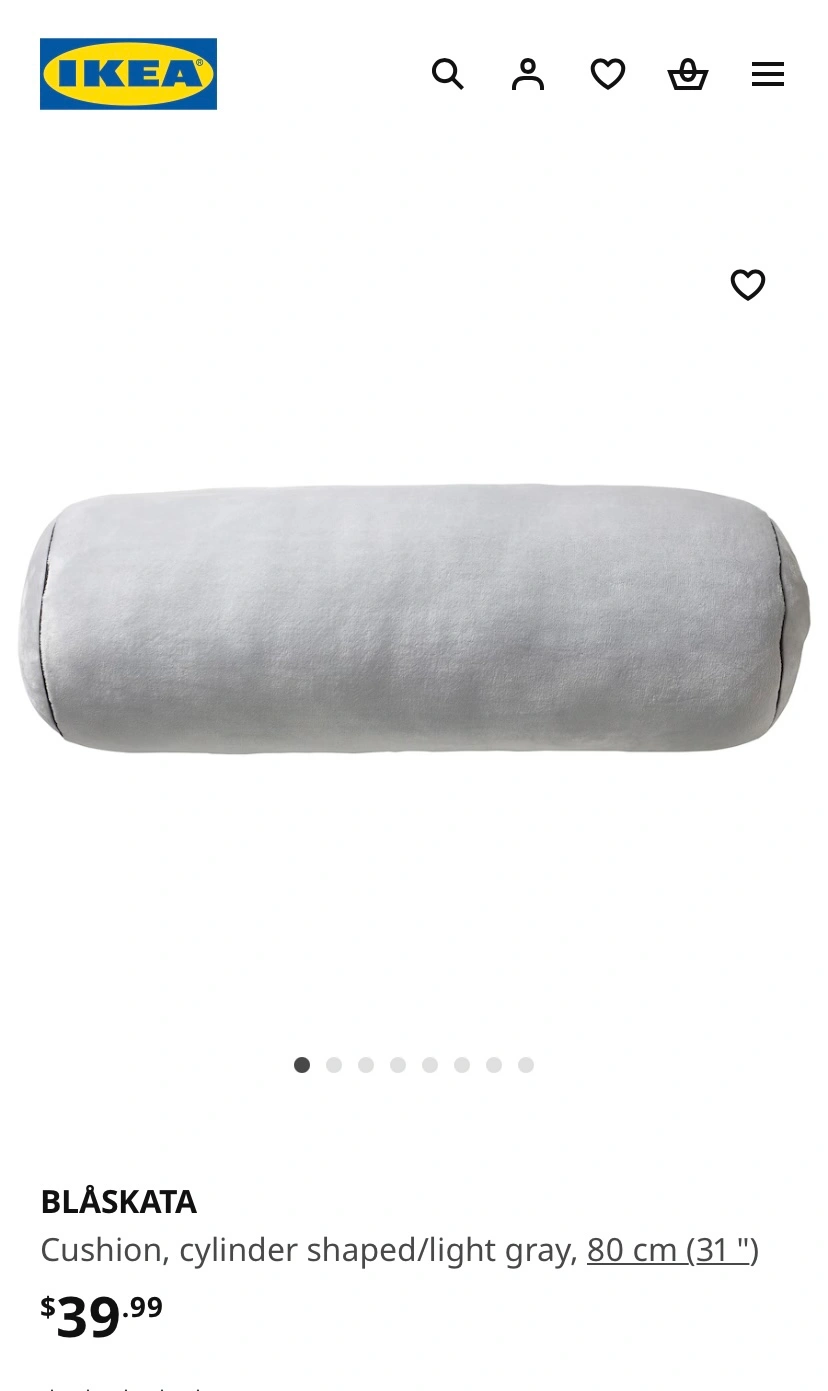 IKEA Blåskata cylinder-shaped cushion in light grey. 80 cm (31") long.