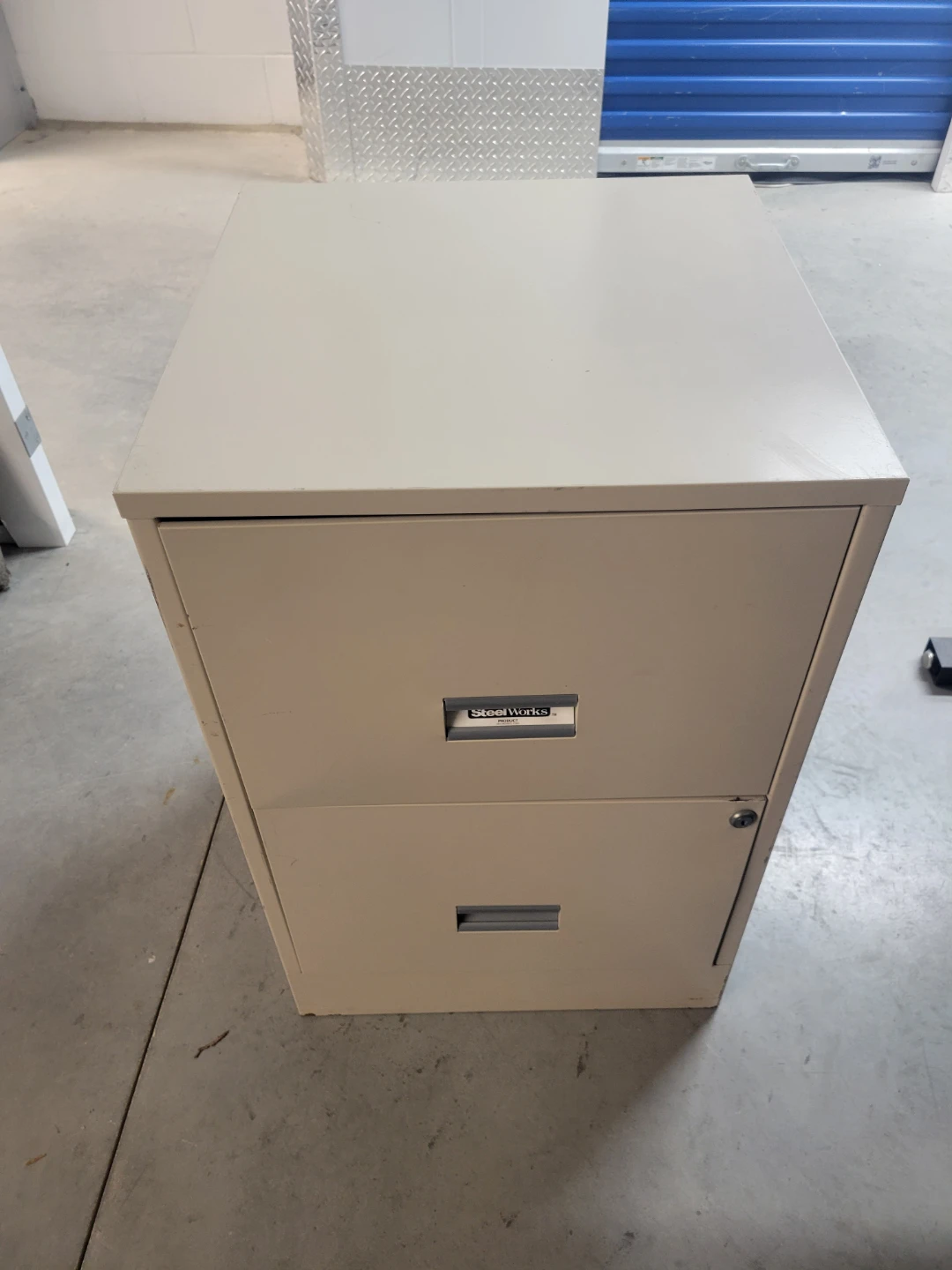 A beige 2-drawer filing cabinet from Steelcase. It's a standard size for office documents. Keep your important papers organized!