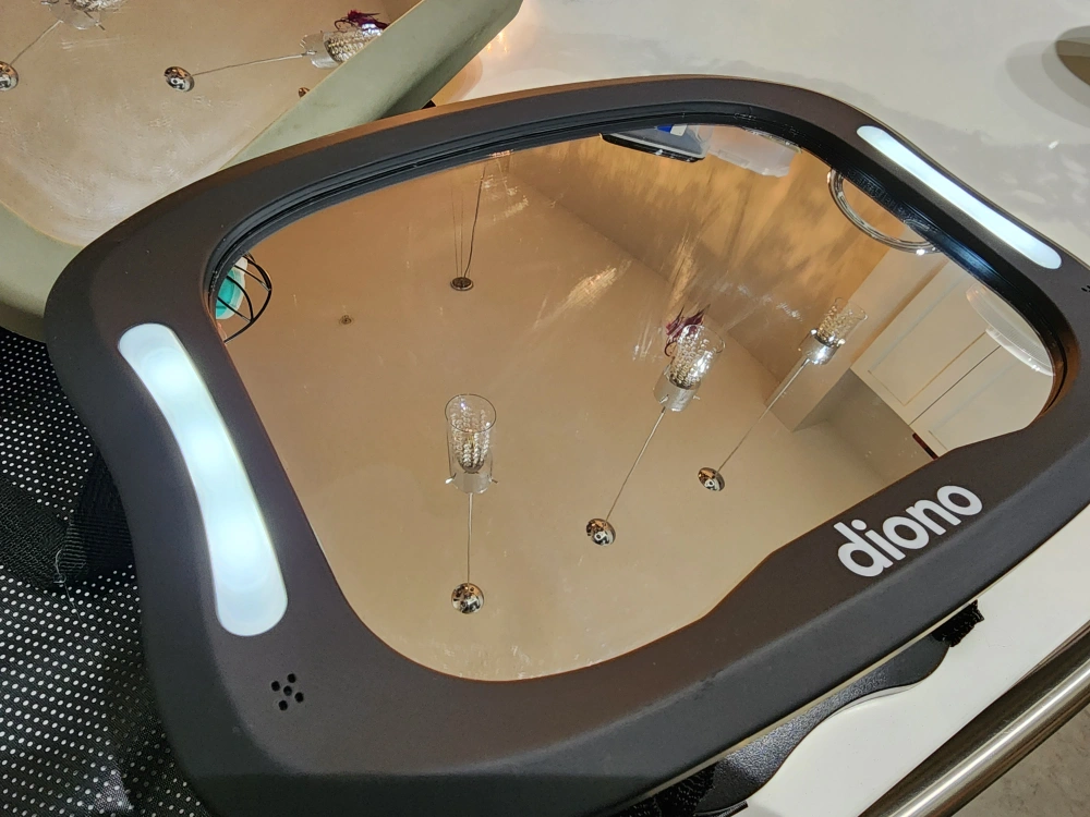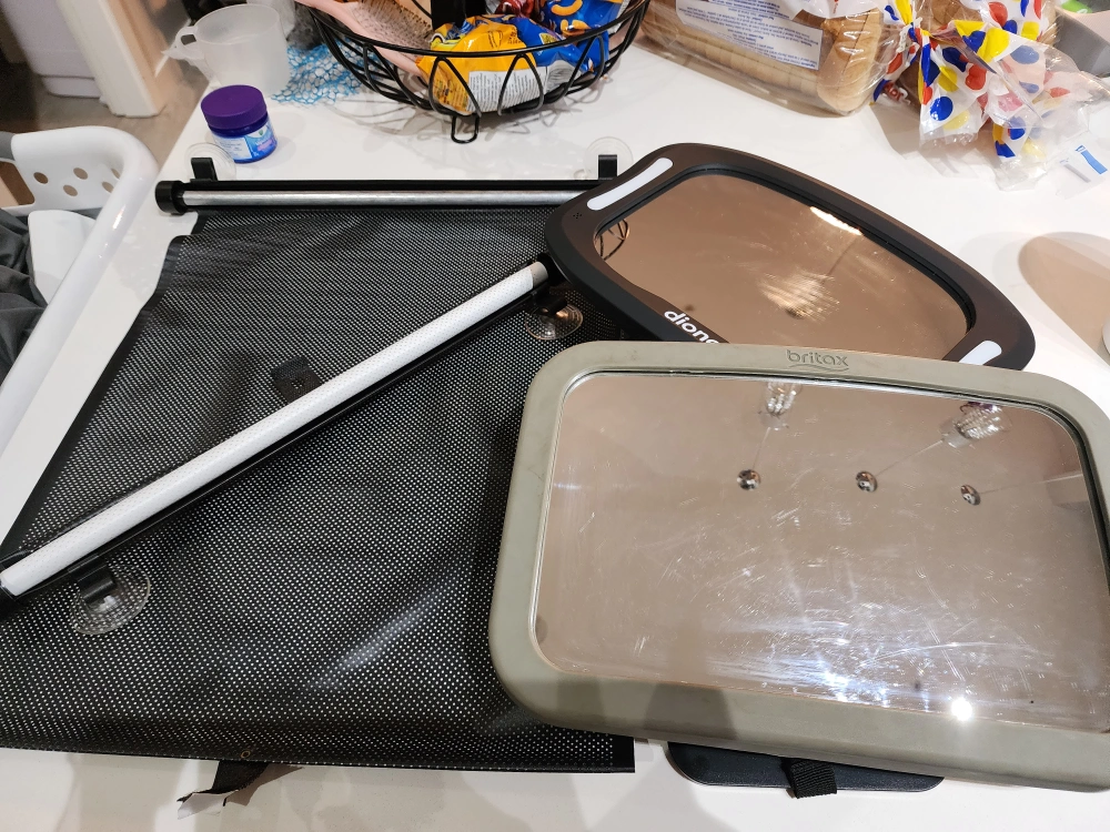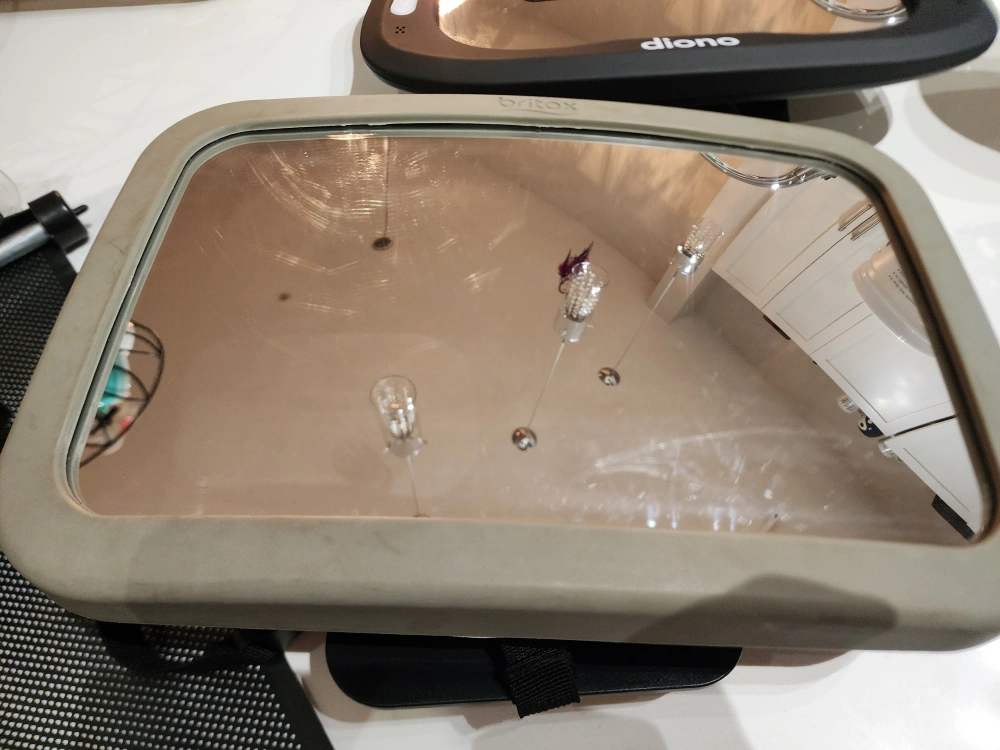 This is a Diono rearview mirror for your car. It has a wide angle view, adjustable straps, and is battery operated. (Batteries not included)