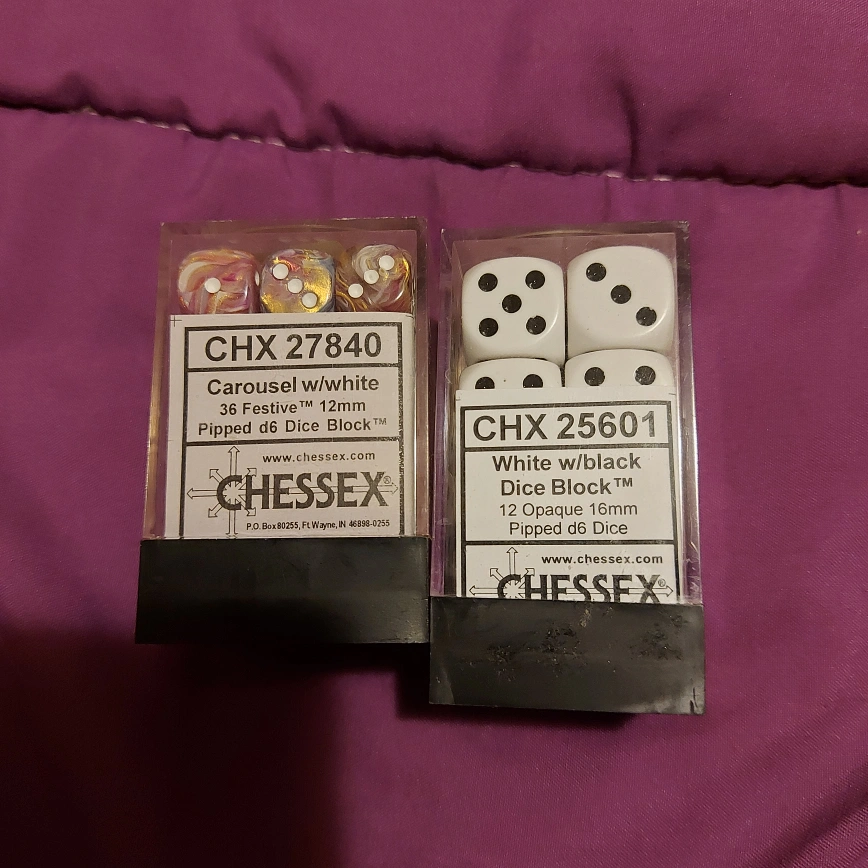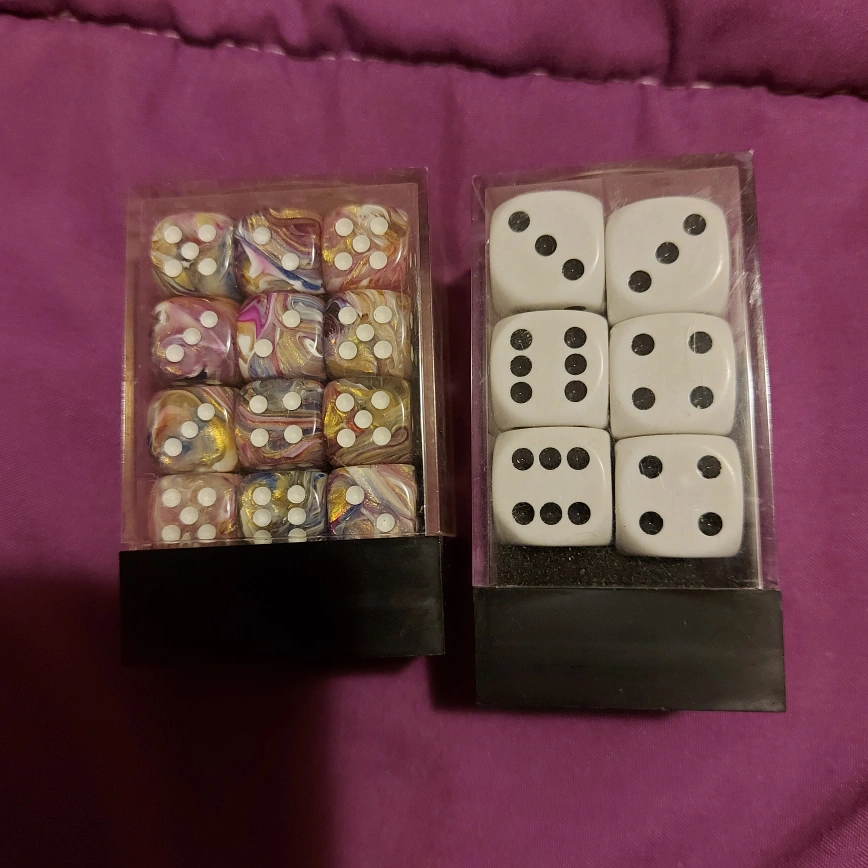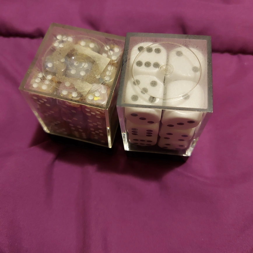 1000+Two sets of dice. One white and black dice (12). The other is a set of 36 dice with a purple swirl design with sparkly gold. Barely used, containers are a bit dusty. Cash only. Pick up at Pape Station.