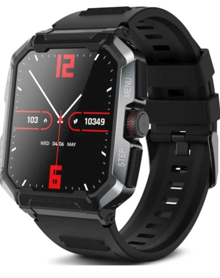 83Smartwatch with black band and silver bezel.