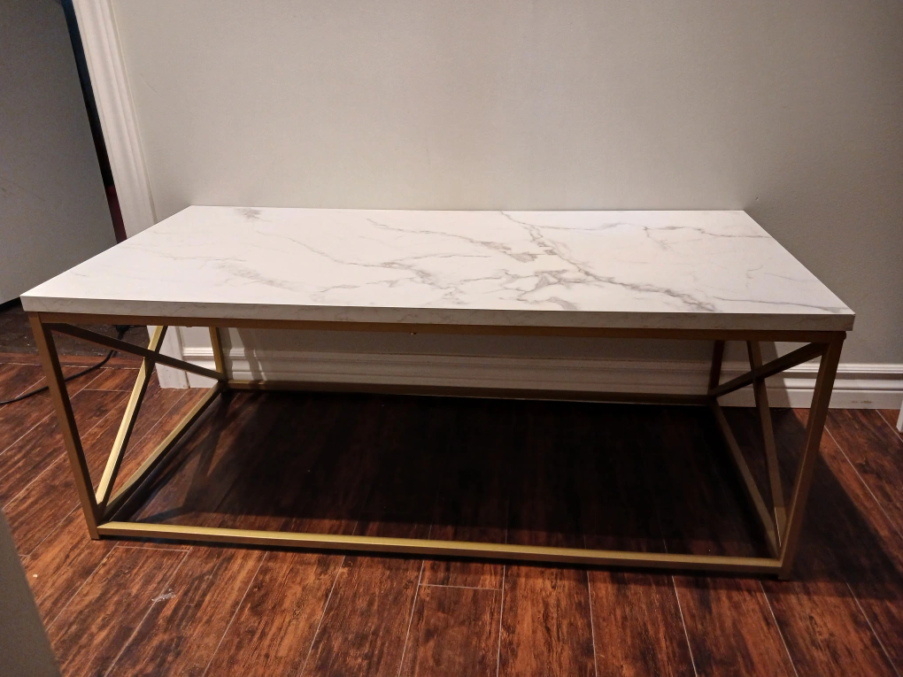 Beautiful coffee table with a marble top and gold legs. It is sturdy and looks great in any room.