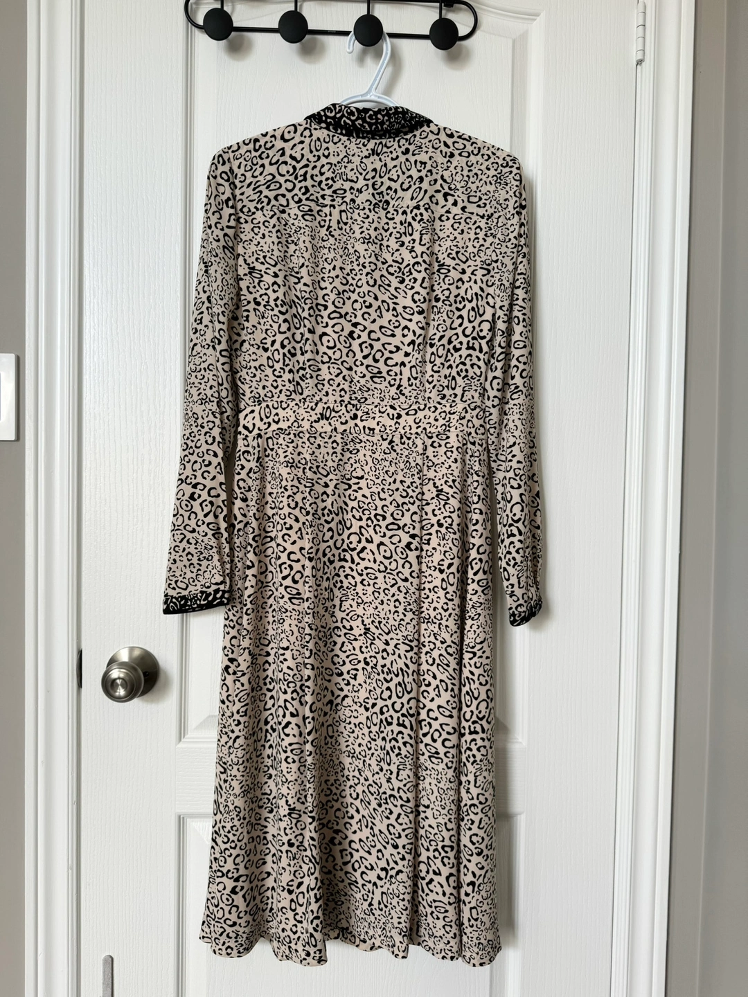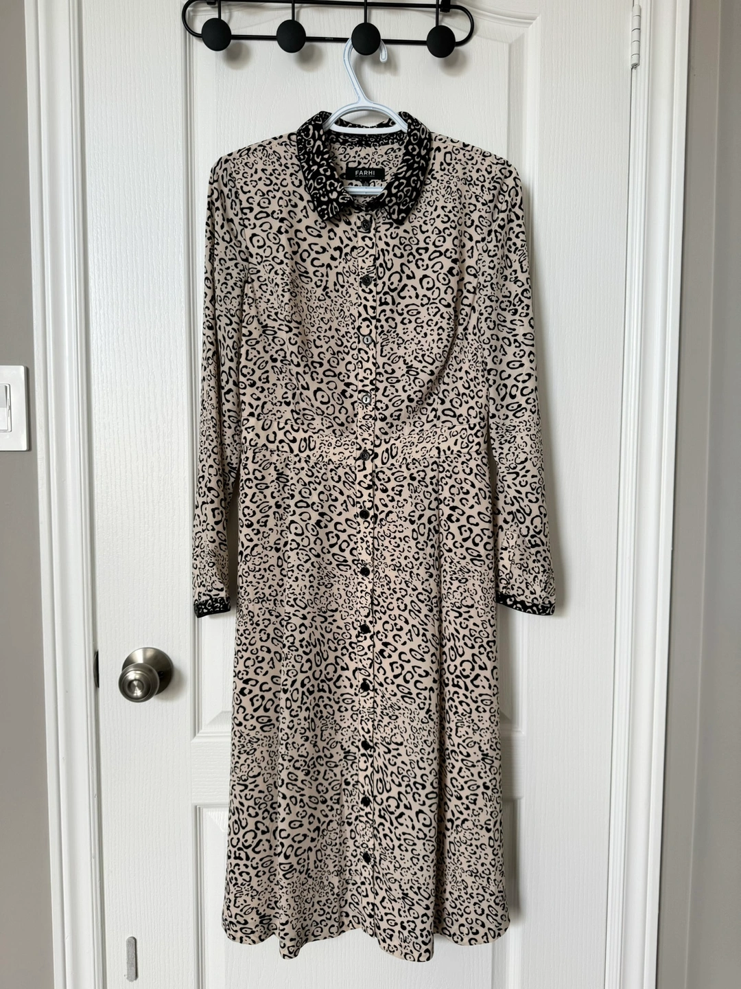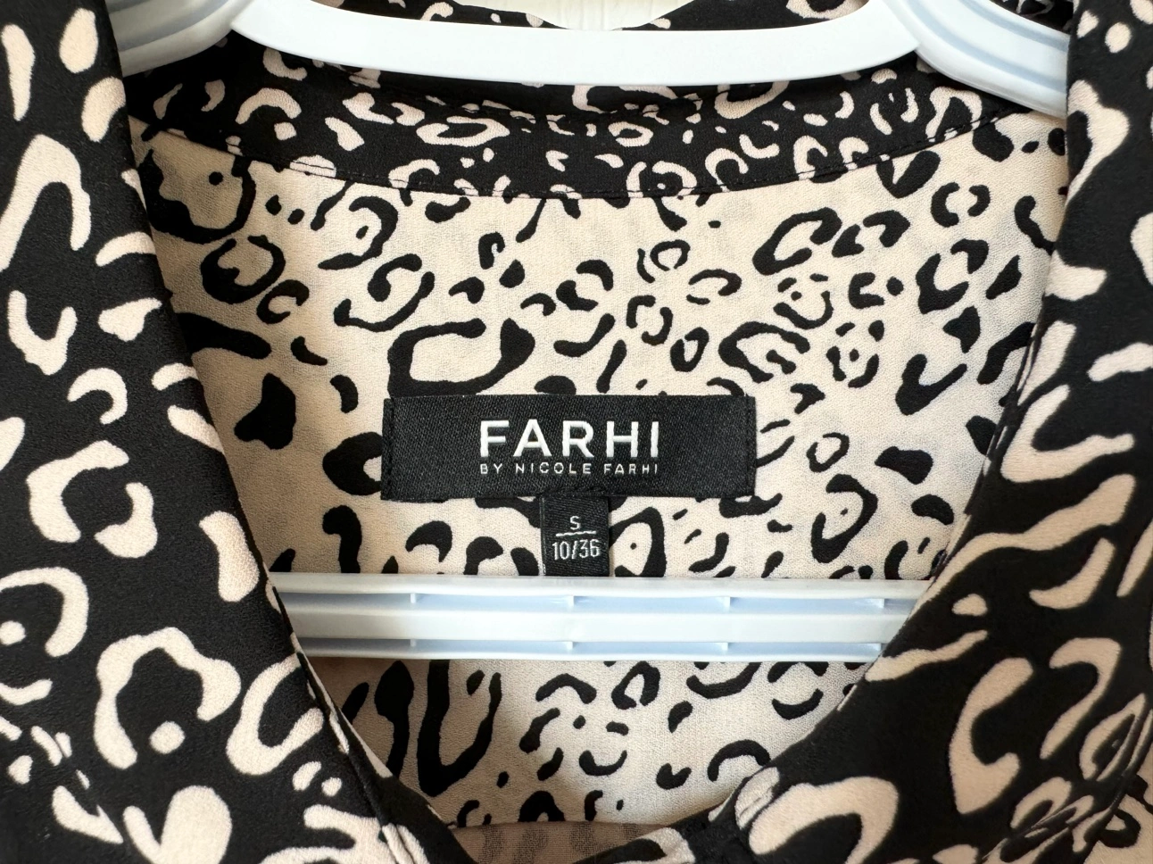 Size Small, Long Sleeve, Button Up, Collar, Beige and Black Colouring. Poly chiffon with Poly lining.