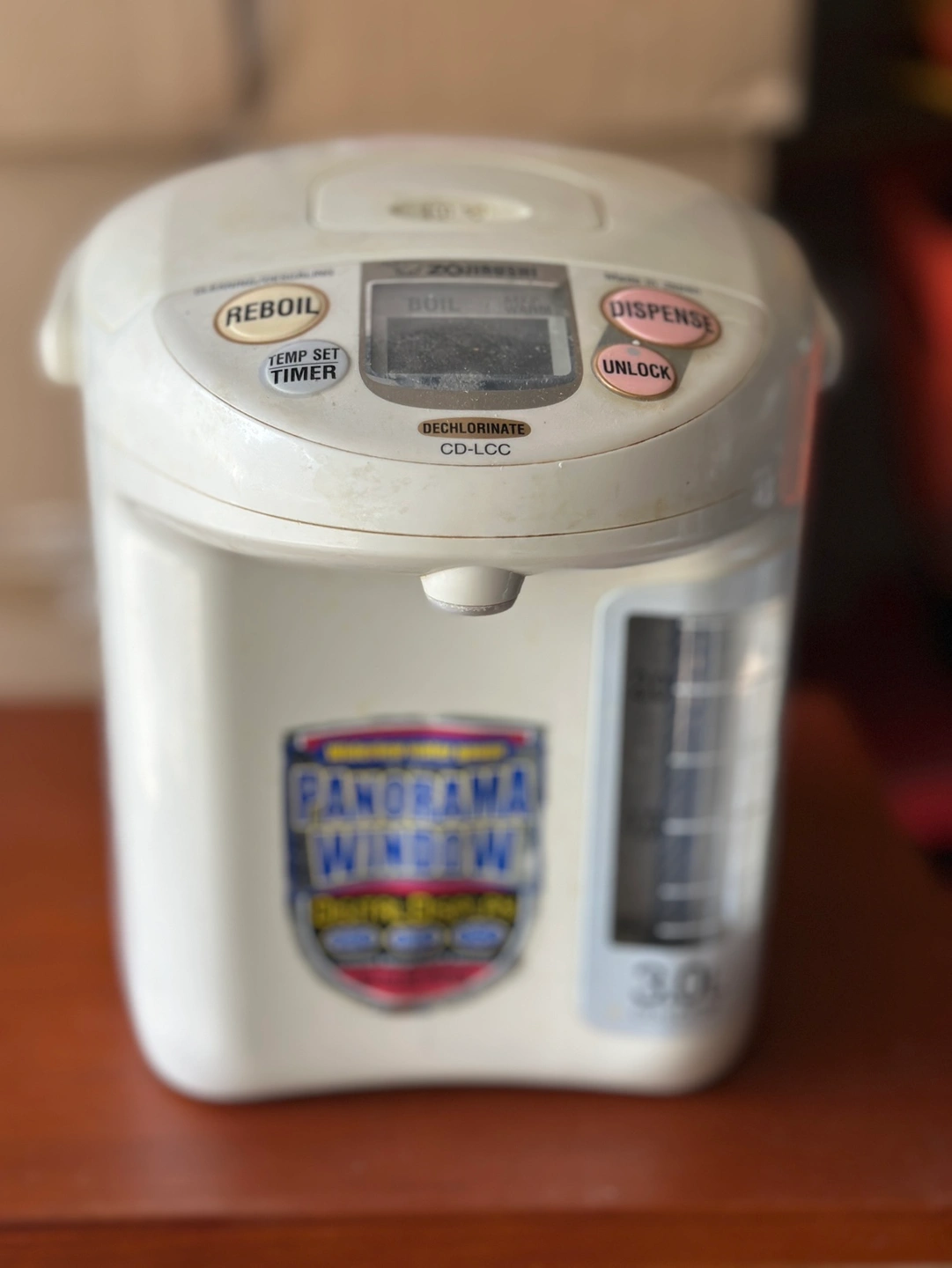 White electric kettle with a digital display, a timer, and various temperature settings.