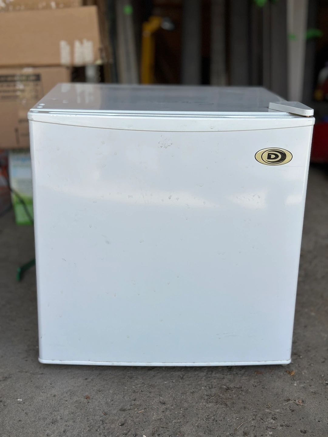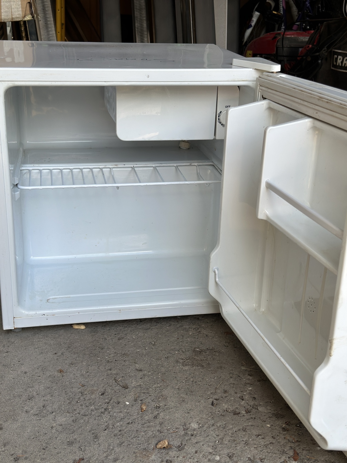 This is a small white fridge in good working order. It has a small freezer compartment. It comes with a wire shelf inside the fridge. The fridge measures approximately 18.5”wide x 17”deep x 19” tall. This fridge would be perfect for a dorm room, office, or small apartment.