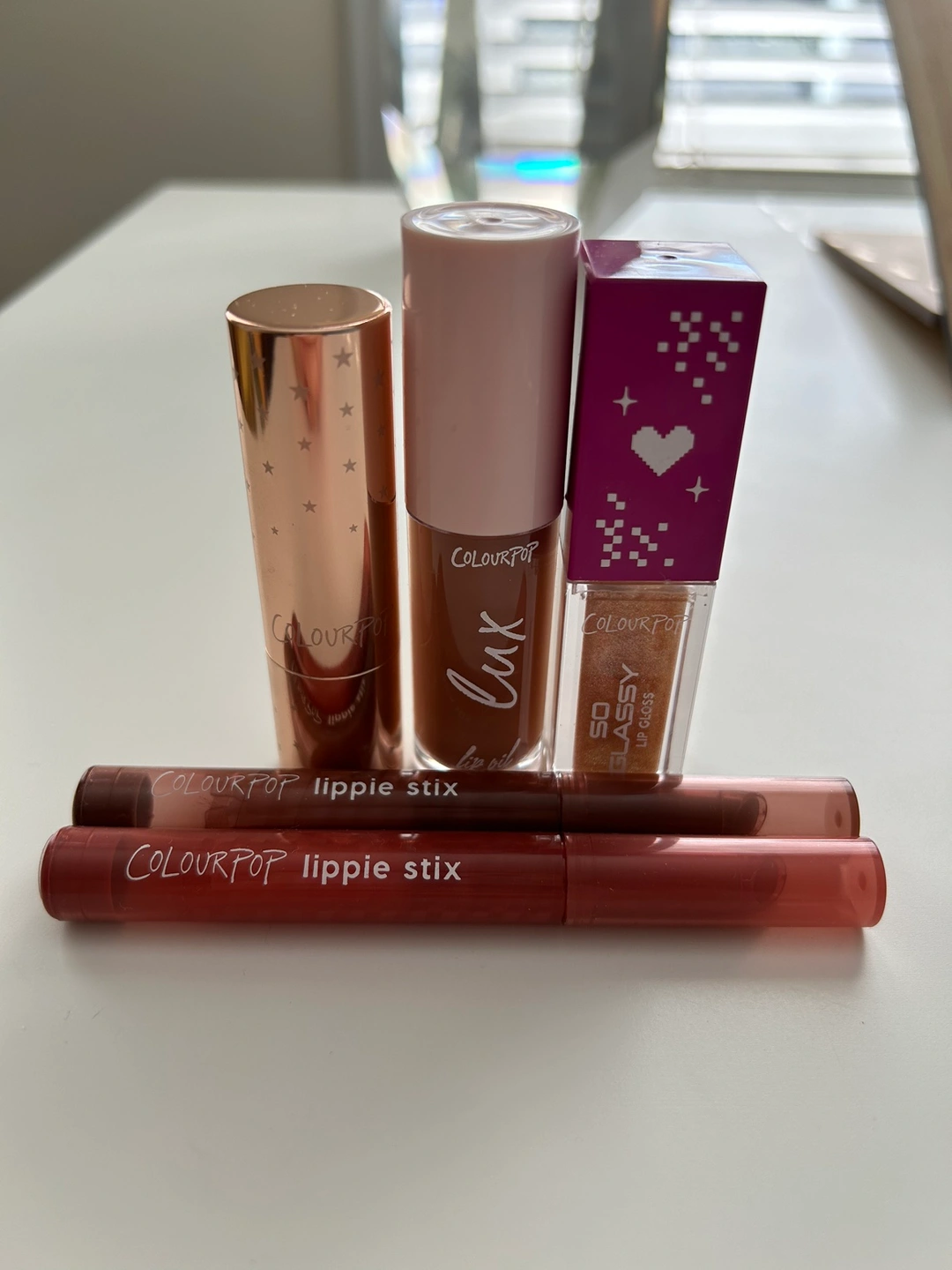 245Lip products from Colorpop company Please note: they are tested 1-2 times on myself, so they are not brand new. They are not my type of lip products, so they were just sitting in my cosmetic bag. 2 lip sticks (like a retractable lipstick in darker and lighter brown shades) A usual lipstick in Virgo Moon shade (brownish) 2 lip glosses: sparkly and caramel. Let me know if you want them all of whichever ones.