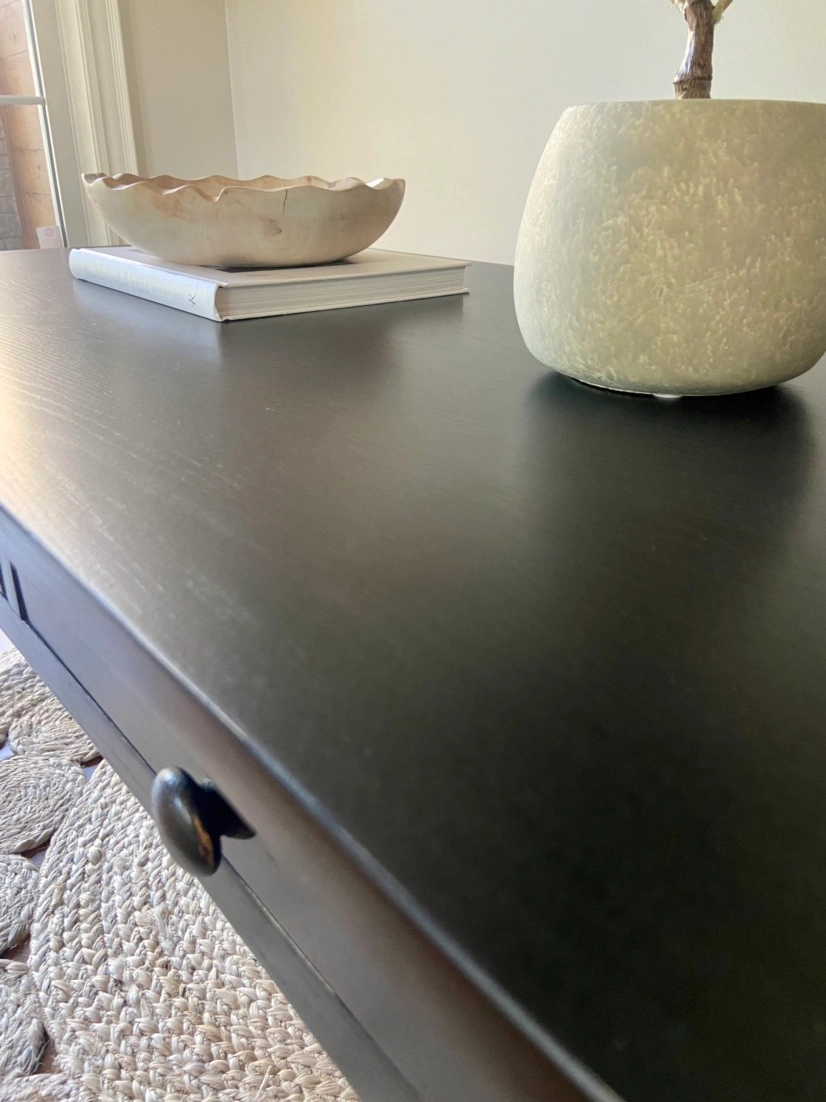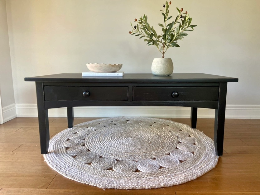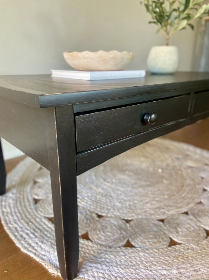 Solid oak table stained in a true black colour, distressed for a rustic look, and sealed for long-term durability. The beautiful wood grain peaks through the modern stain colour. 2 drawers for storage.