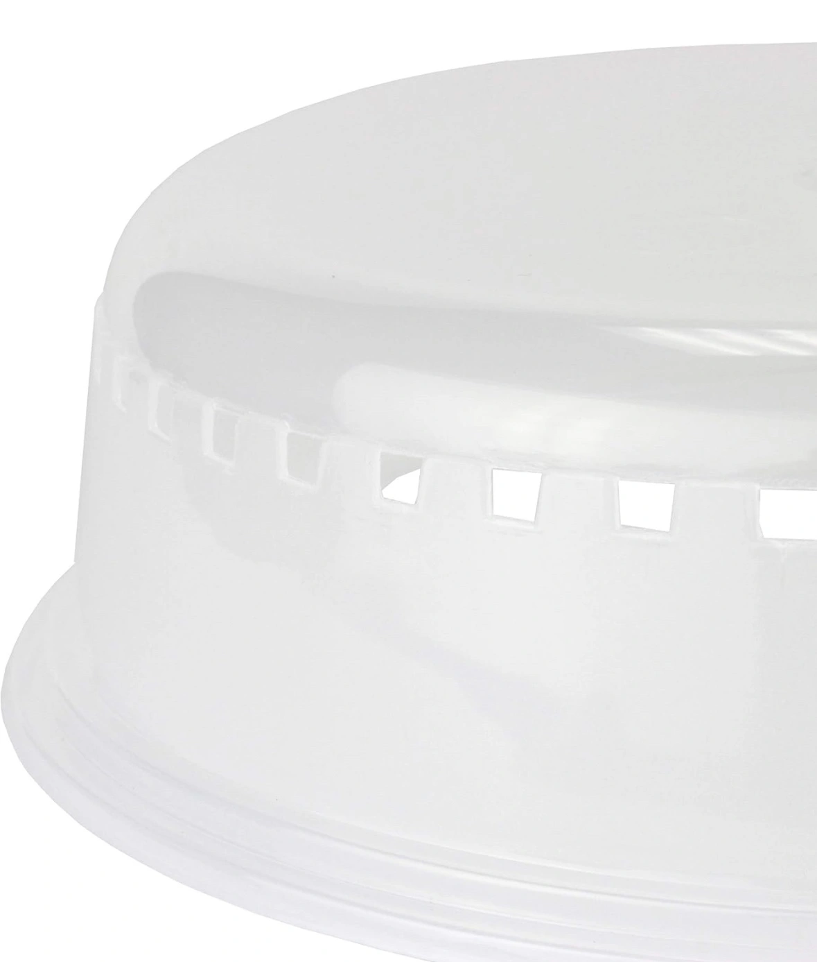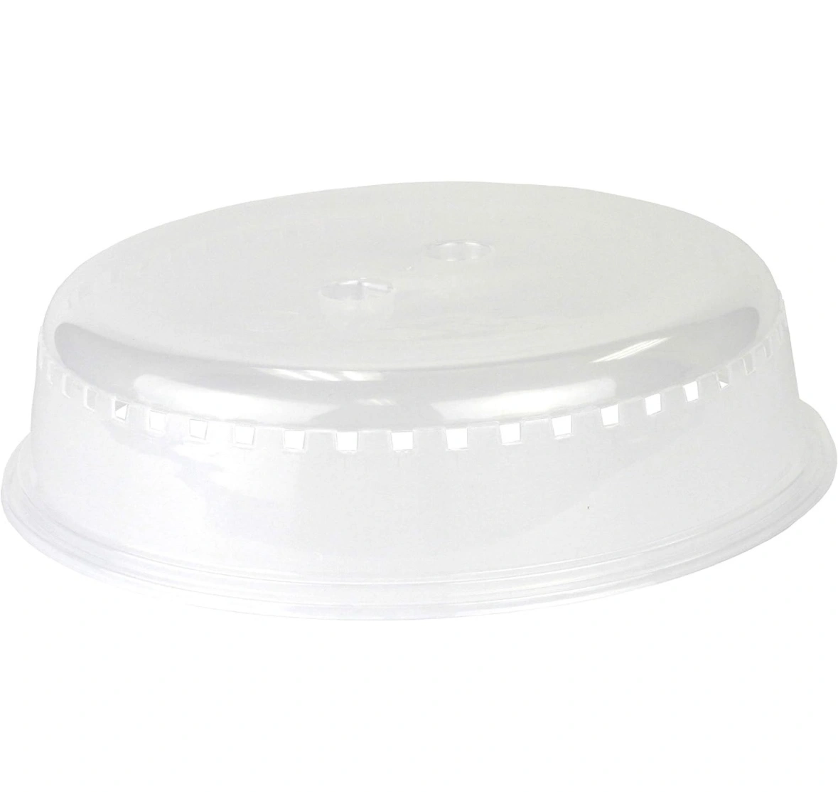 Clear plastic microwave cover with vents. Top rack dishwasher safe. Great for covering food while heating in the microwave.