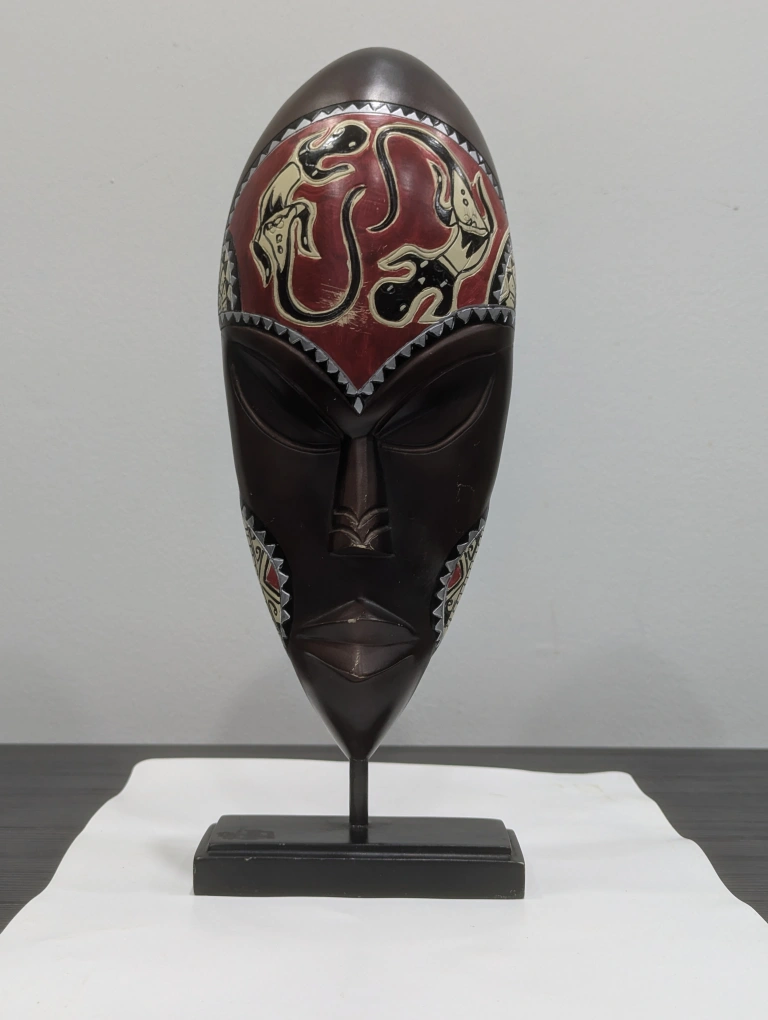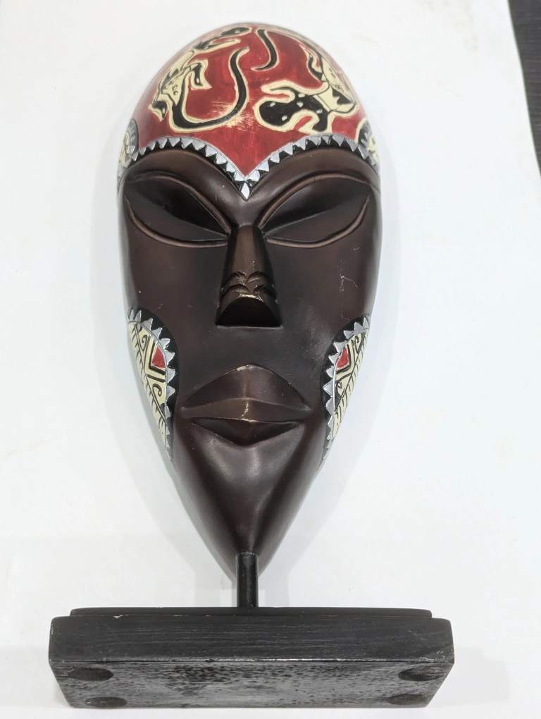 A beautiful wooden mask with red, black and silver details. It is on a wooden stand with a black metal rod.